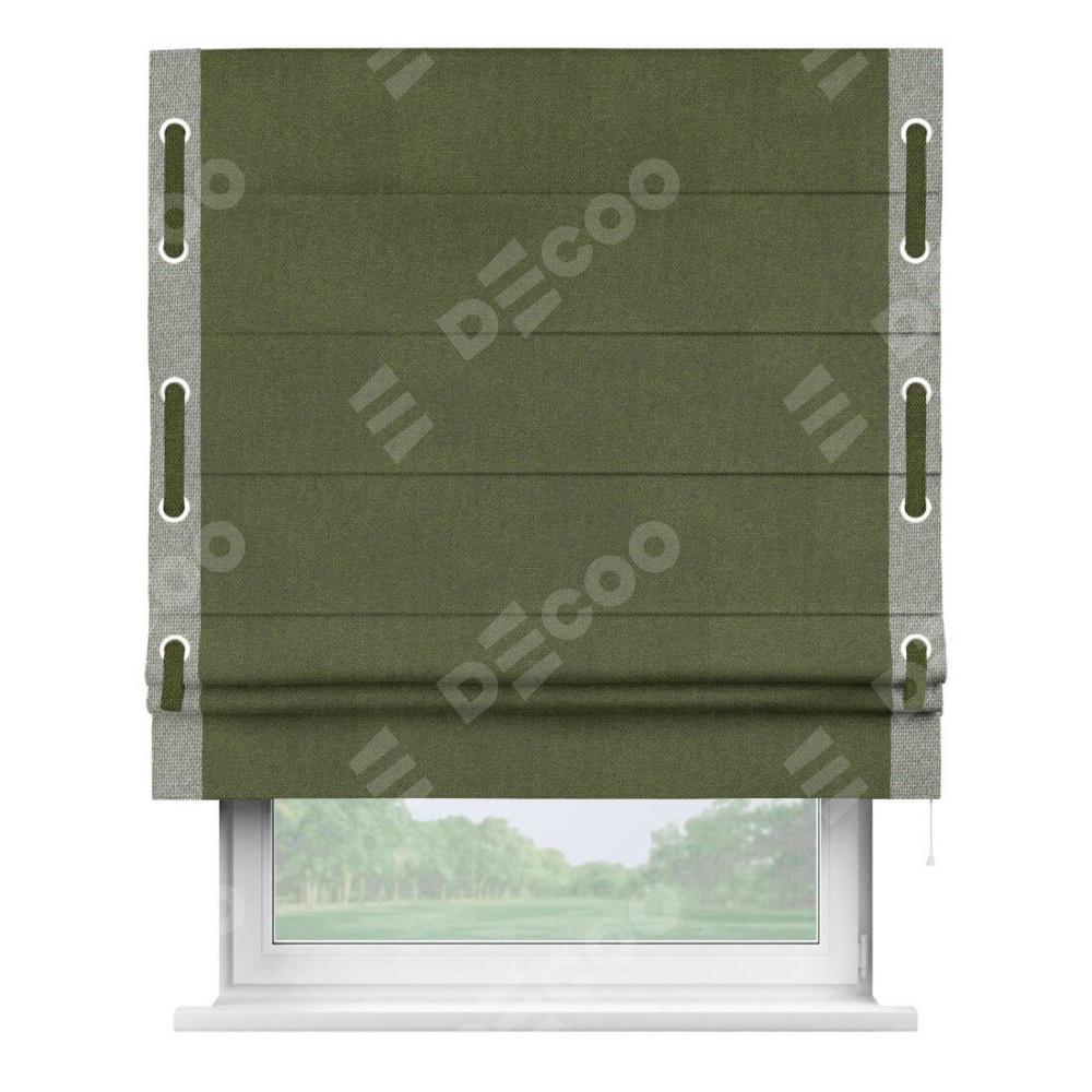 Римская штора «Кортин» для проема, лён димаут салатовый с кантом Стрим Дуо (люверсы с пояском)
