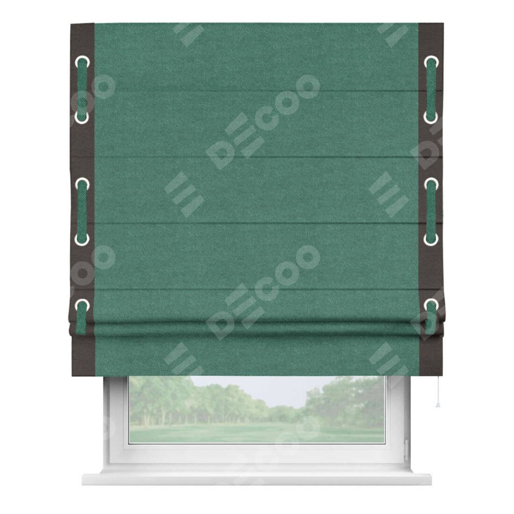 Римская штора «Кортин» для проема, лён димаут светло-бирюзовый с кантом Стрим Дуо (люверсы с пояском)
