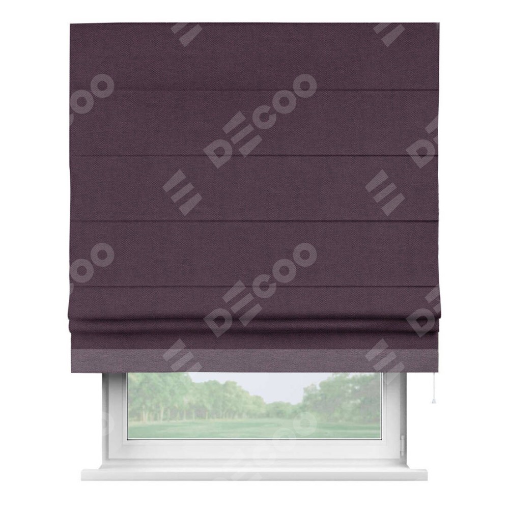 Римская штора производителя «Cortin», используется для проёма, пошита из ткани лён димаут фиолетовый, артикул 16267. Отделка шторы кантом «Джестер», ткань для канта используется из льна димаут разной расцветки на выбор. Имеет универсальный механизм и подходит для монтажа: на потолок, на стену и в нишу.