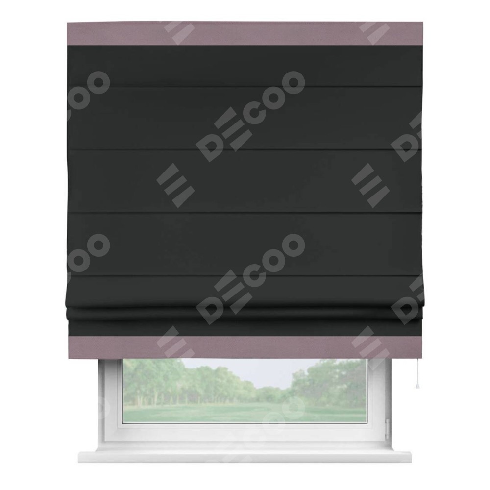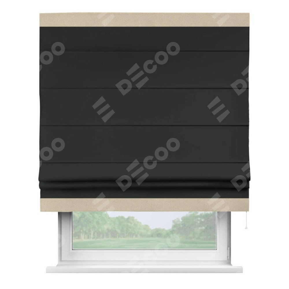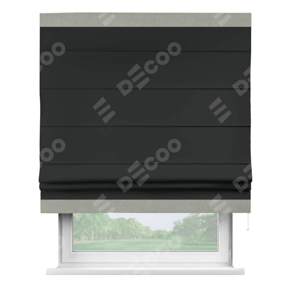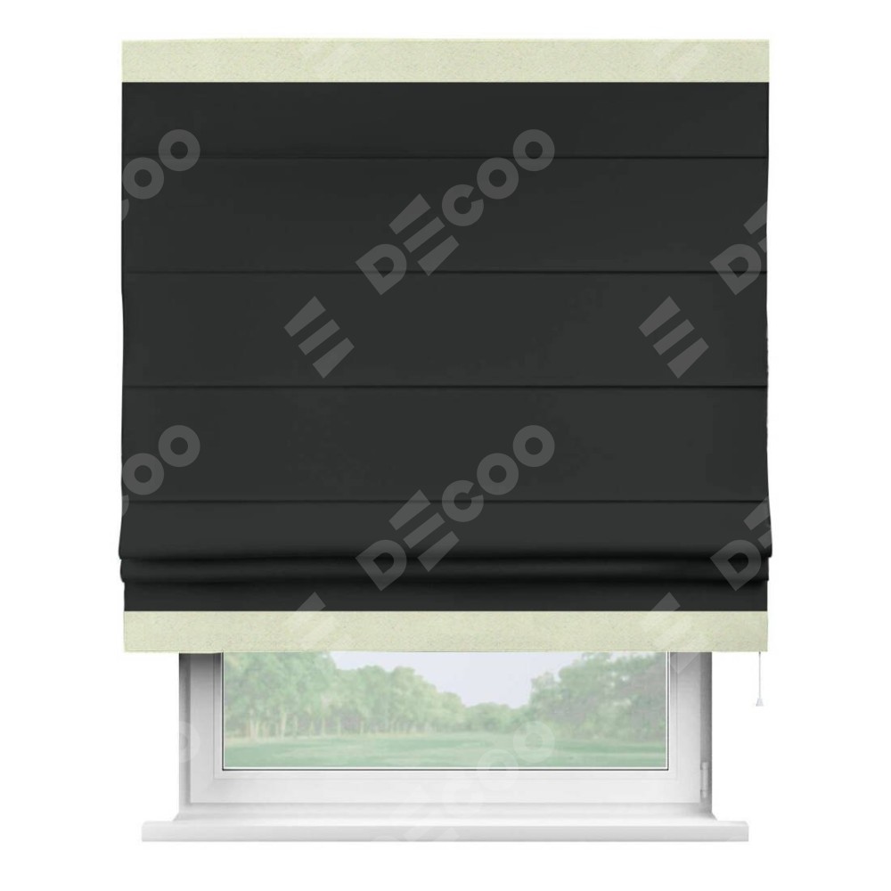 Римская штора производителя «Cortin», используется для проёма, пошита из ткани блэкаут однотонный черный, артикул ткани 91571−2. Отделка шторы кантом «Горизонт», ткань для канта используется из блэкаута однотонного разной расцветки на выбор. Имеет универсальный механизм и подходит для монтажа: на потолок, на стену и в нишу.