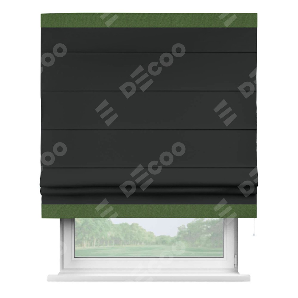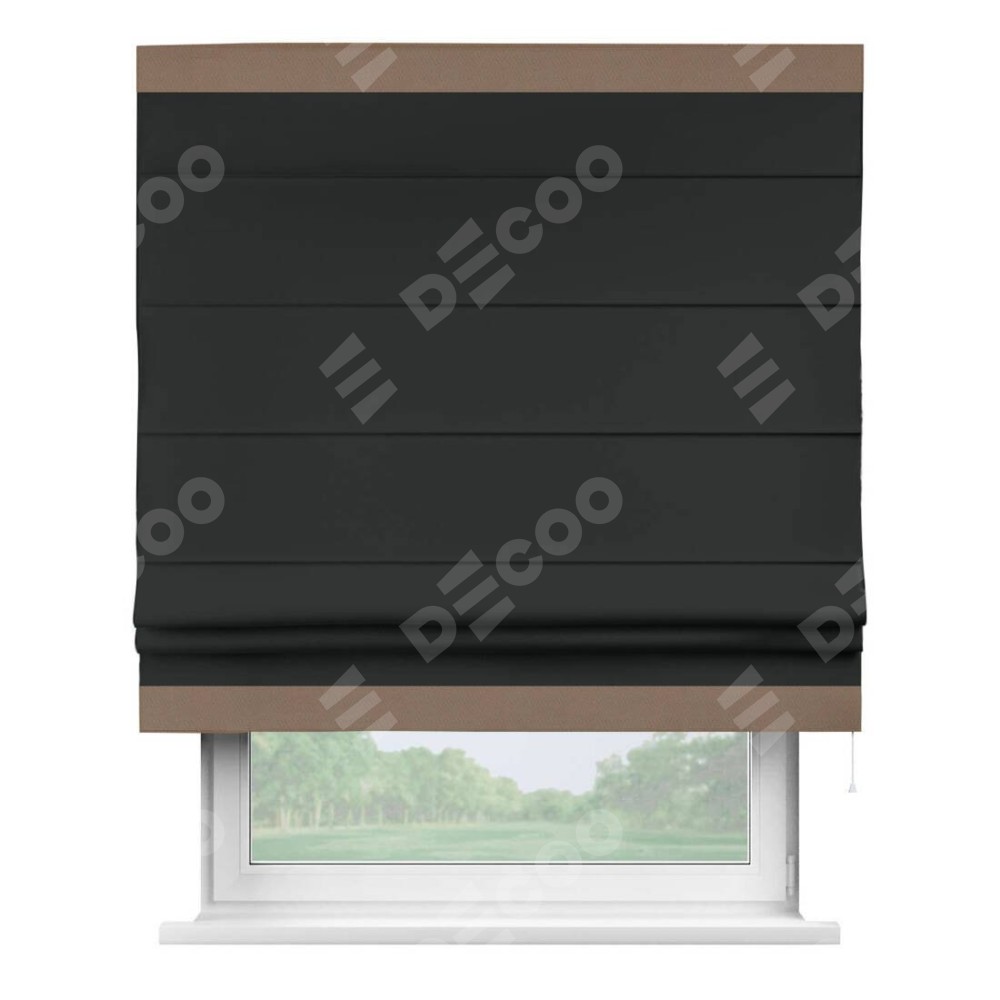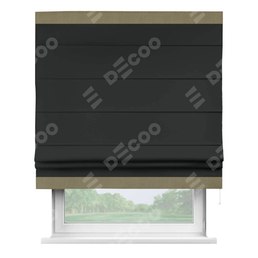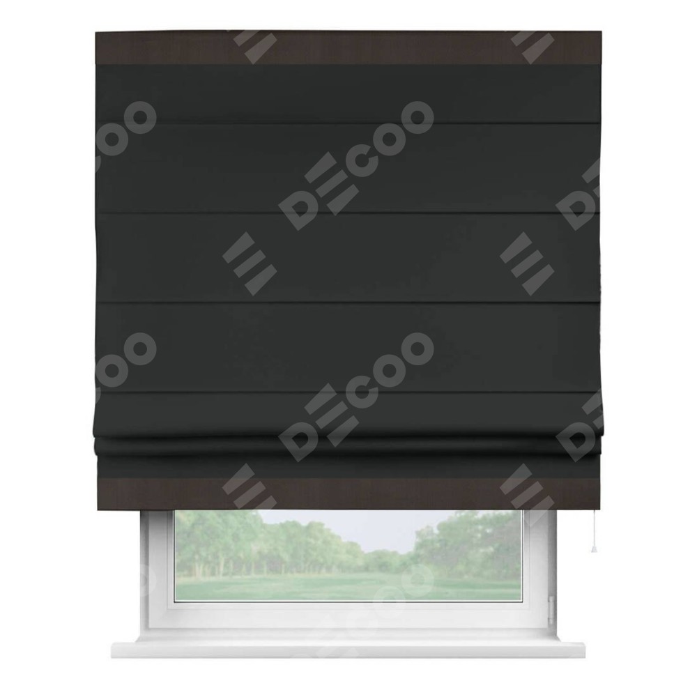 Римская штора производителя «Cortin», используется для проёма, пошита из ткани блэкаут однотонный черный, артикул ткани 91571−2. Отделка шторы кантом «Горизонт», ткань для канта используется из блэкаута однотонного разной расцветки на выбор. Имеет универсальный механизм и подходит для монтажа: на потолок, на стену и в нишу.