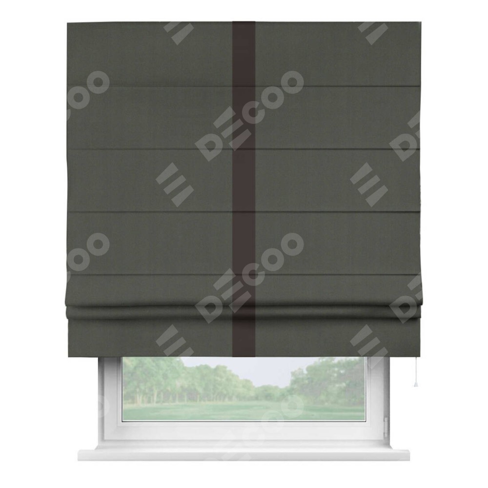 Римская штора производителя «Cortin», используется для проёма, пошита из ткани блэкаут однотонный дымчато-серый, артикул ткани 91571−1. Отделка шторы кантом «Хайвей», ткань для канта используется из блэкаута однотонного разной расцветки на выбор. Имеет универсальный механизм и подходит для монтажа: на потолок, на стену и в нишу.