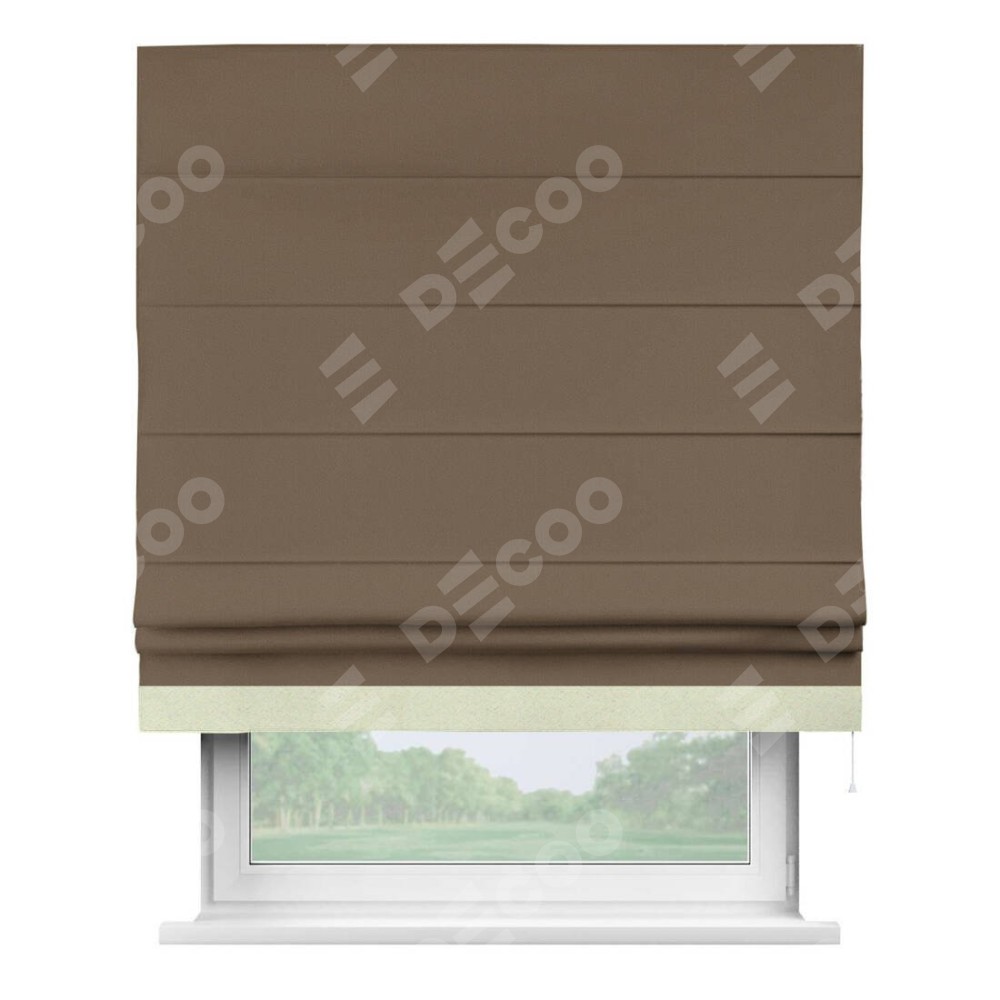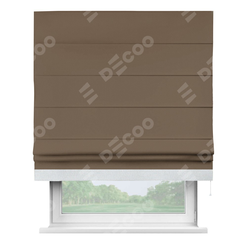 Римская штора производителя «Cortin», используется для проёма, пошита из ткани блэкаут однотонный коричневый, артикул ткани 91334. Отделка шторы кантом «Джестер», ткань для канта используется из блэкаута однотонного разной расцветки на выбор. Имеет универсальный механизм и подходит для монтажа: на потолок, на стену и в нишу.