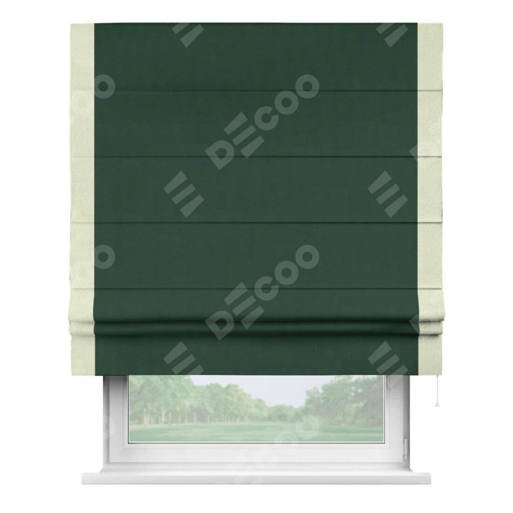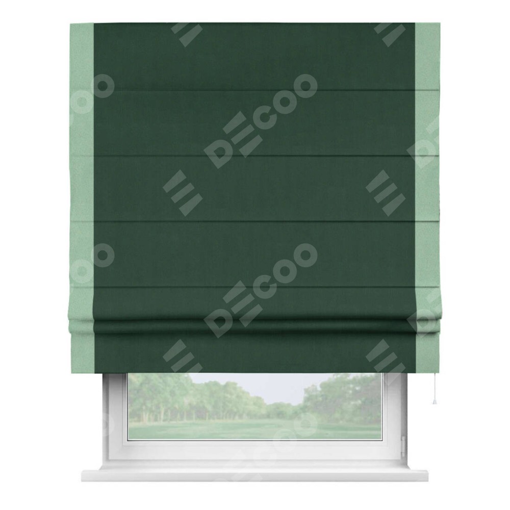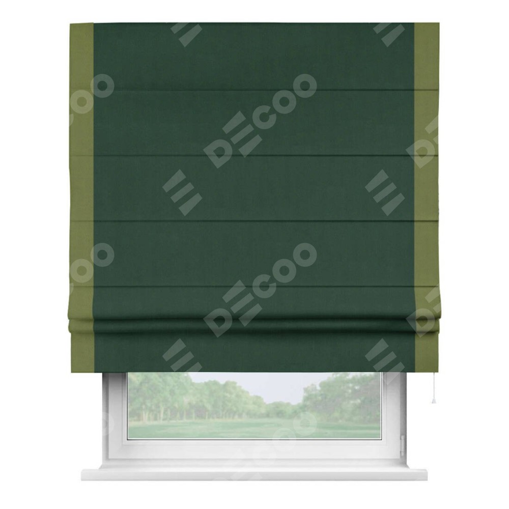 Римская штора производителя «Cortin», используется для проёма, пошита из ткани блэкаут однотонный зелёный, артикул ткани 91572−2. Отделка шторы кантом «Стрим Дуо», ткань для канта используется из блэкаута однотонного разной расцветки на выбор. Имеет универсальный механизм и подходит для монтажа: на потолок, на стену и в нишу.