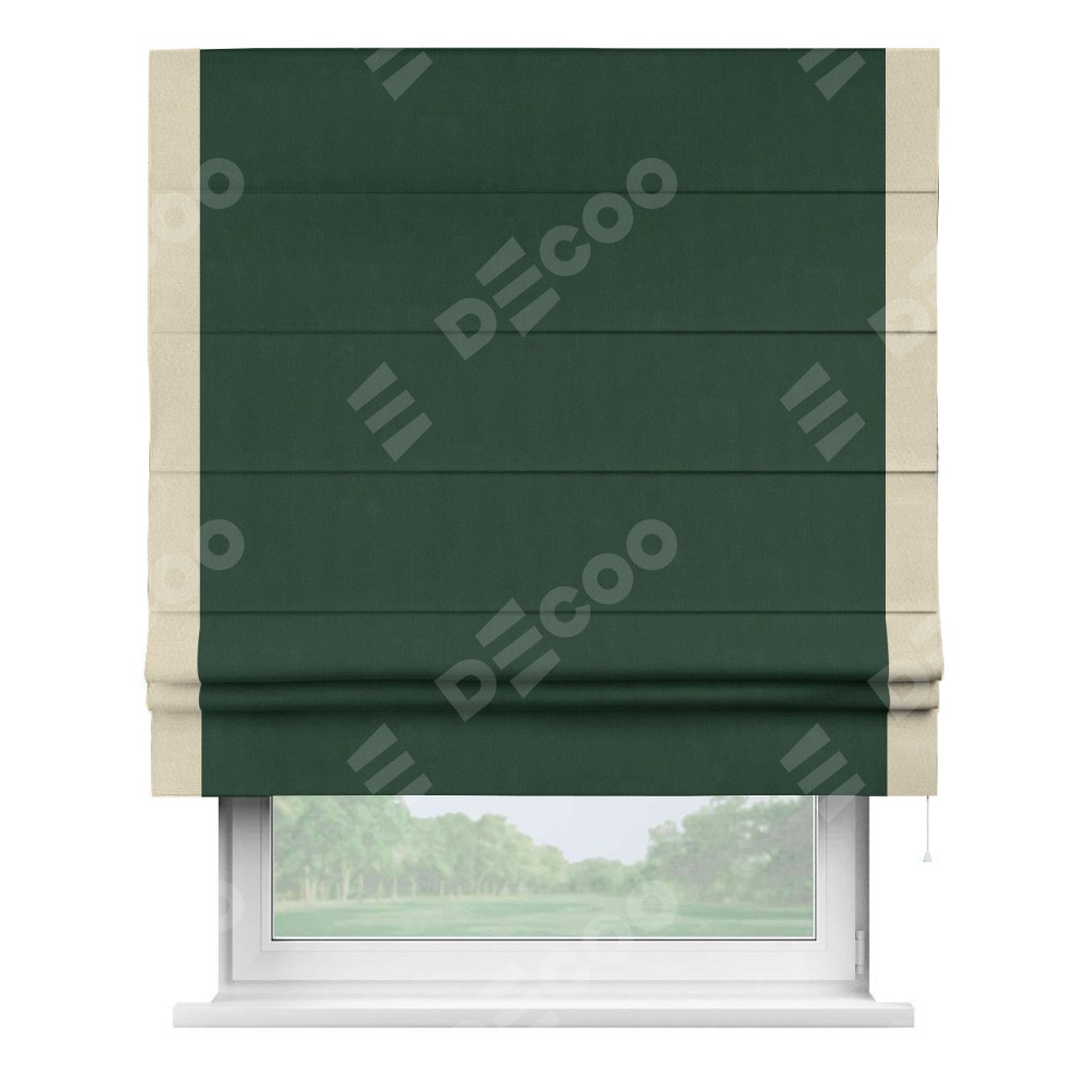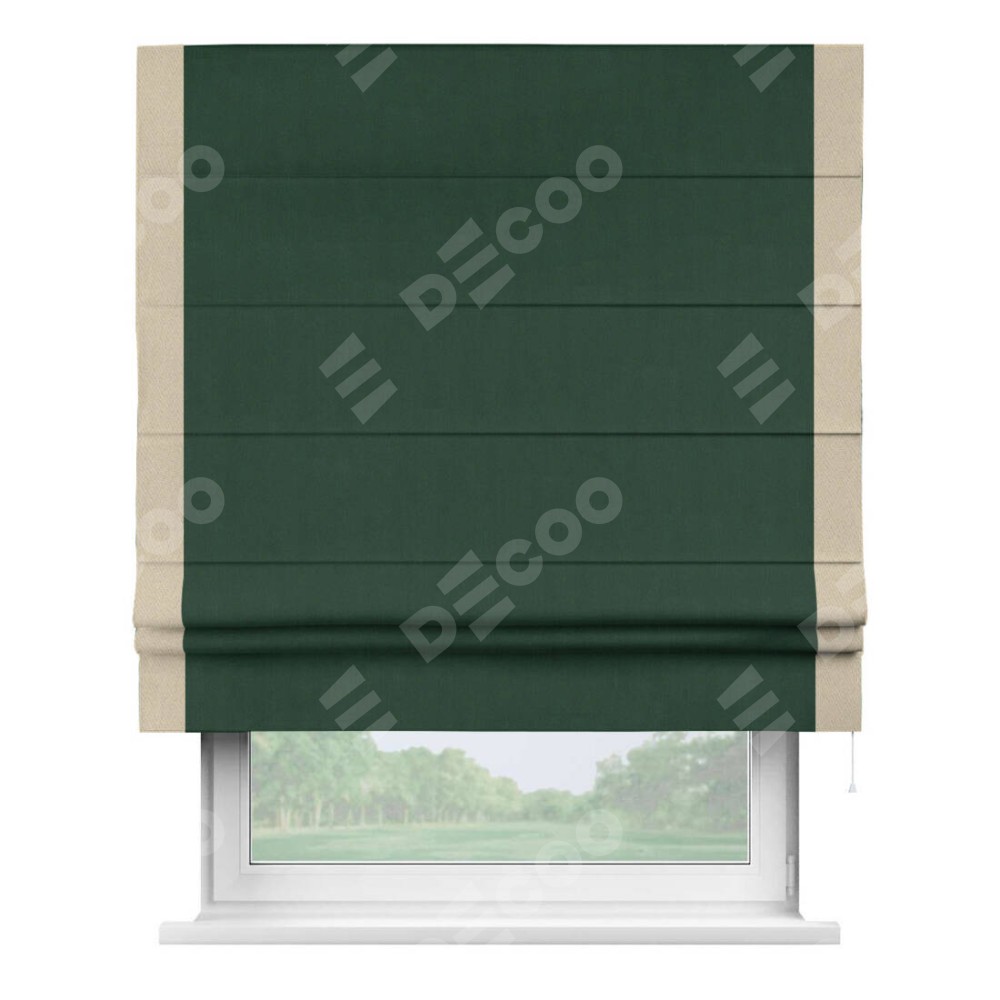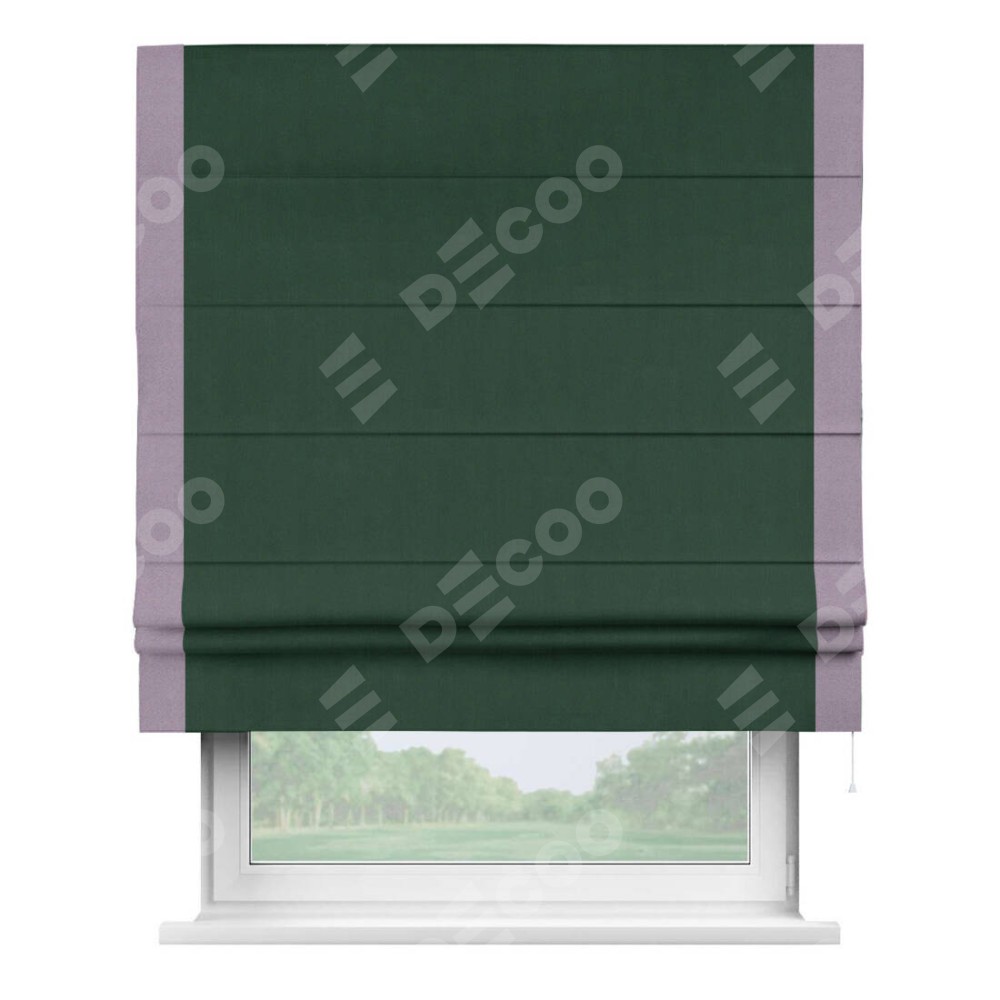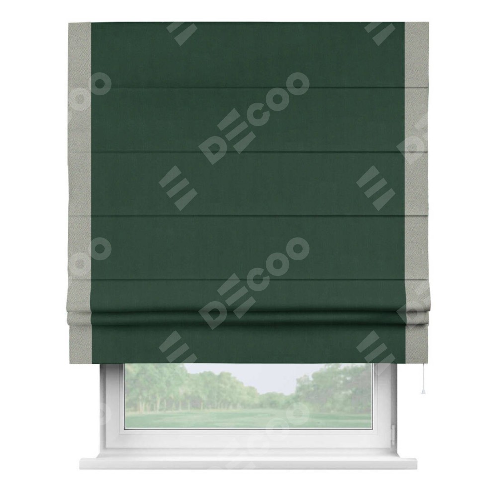 Римская штора производителя «Cortin», используется для проёма, пошита из ткани блэкаут однотонный зелёный, артикул ткани 91572−2. Отделка шторы кантом «Стрим Дуо», ткань для канта используется из блэкаута однотонного разной расцветки на выбор. Имеет универсальный механизм и подходит для монтажа: на потолок, на стену и в нишу.