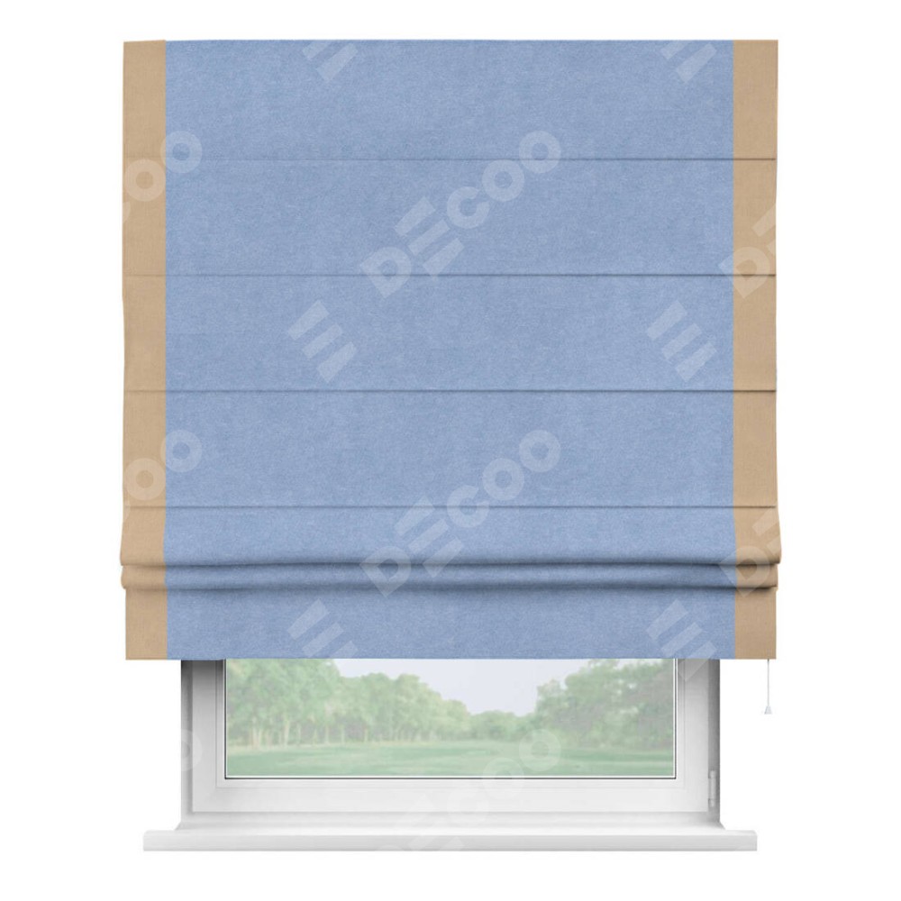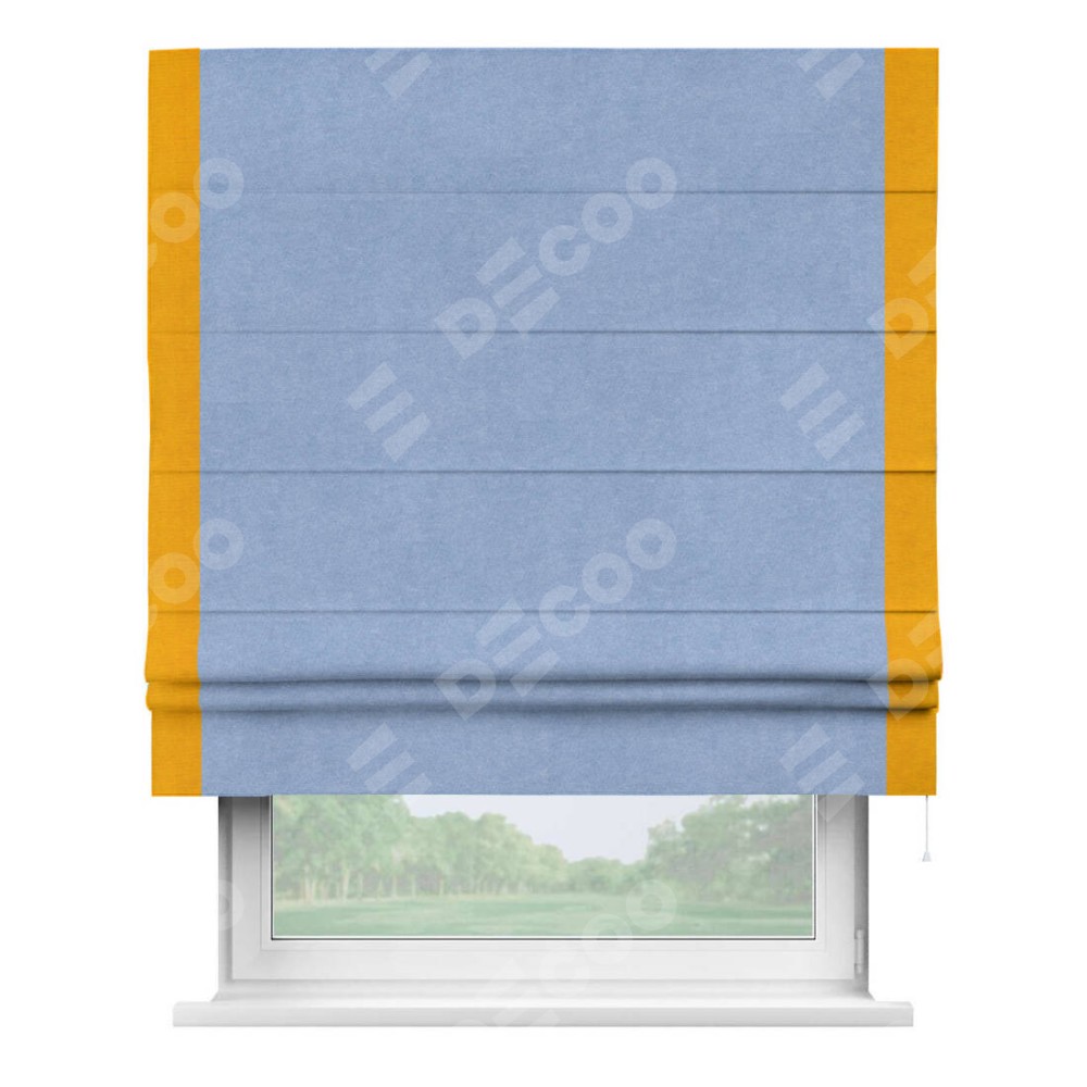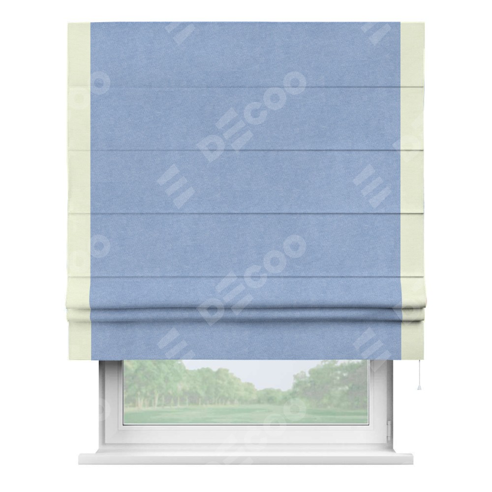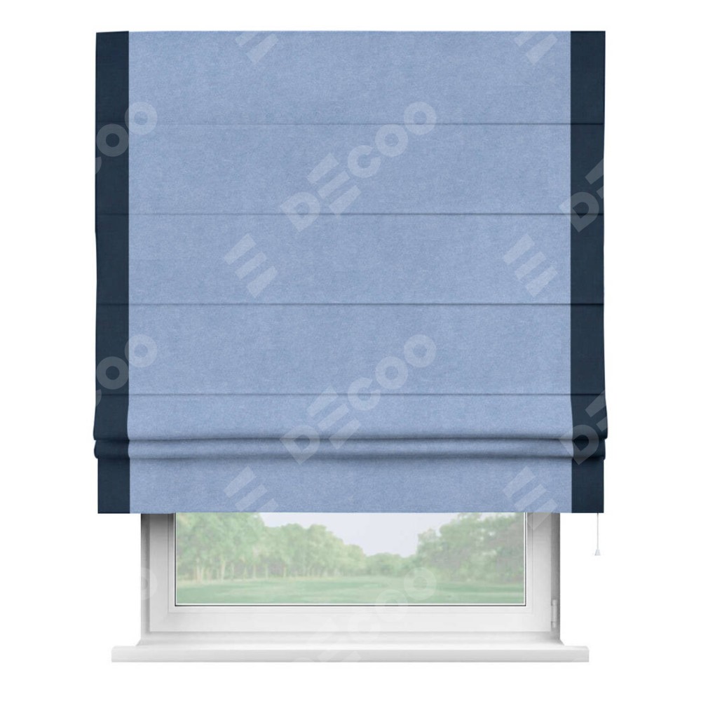 Римская штора производителя «Cortin», используется для проёма, пошита из ткани вельвет васильковый, артикул ткани 33799. Отделка шторы кантом «Стрим Дуо», ткань для канта используется из вельвета разной расцветки на выбор. Имеет универсальный механизм и подходит для монтажа: на потолок, на стену и в нишу.