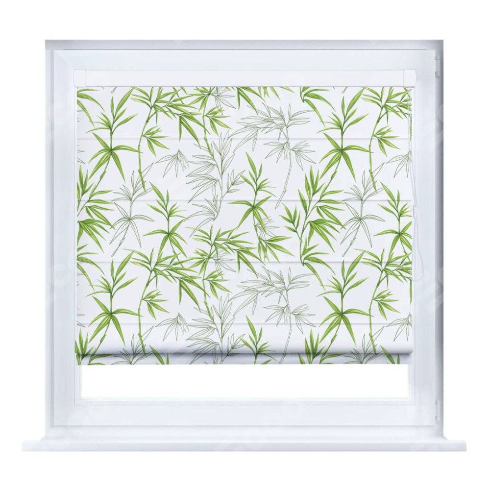 Римская штора производителя «Cortin», устанавливается на створку окна, пошита из ткани блэкаут с нанесением сублимационной печати «Зелёный бамбук». Штора шьётся по индивидуальным размерам, для данного типа римской шторы возможная ширина от 35 до 150 см., высота до 250 см.