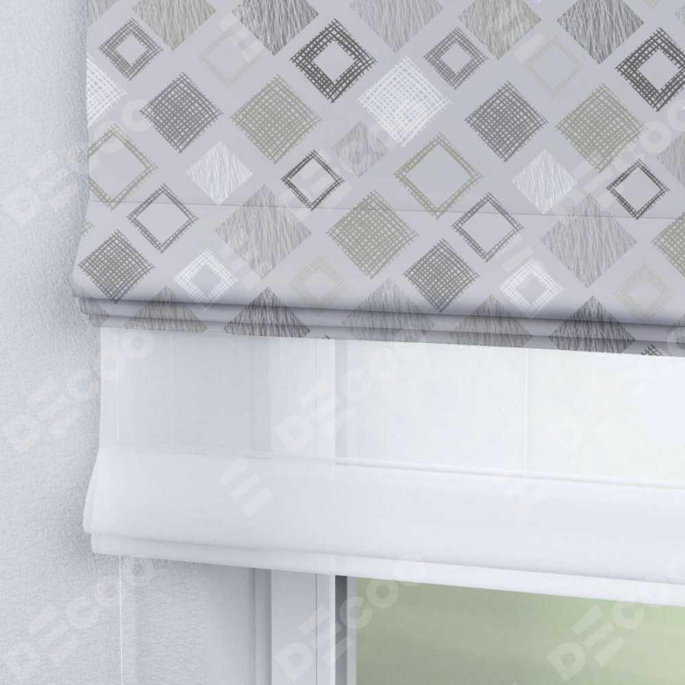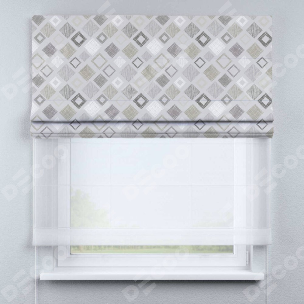 Двойная римская штора «День-ночь» от производителя Cortin предназначена для использования в проёмах. Эта штора уникальна тем, что состоит из двух полотен. На лицевой стороне находится блэкаут с нанесением сублимационной печати «Квадро», обеспечивающий эффективное затемнение. В комплект также входит вторая ткань — легкий белый тюль (артикул: V-01), который добавляет изящества и легкости оформлению окна. Кроме того, доступны и другие разновидности ткани тюль, выбор которых доступен по  ссылке .