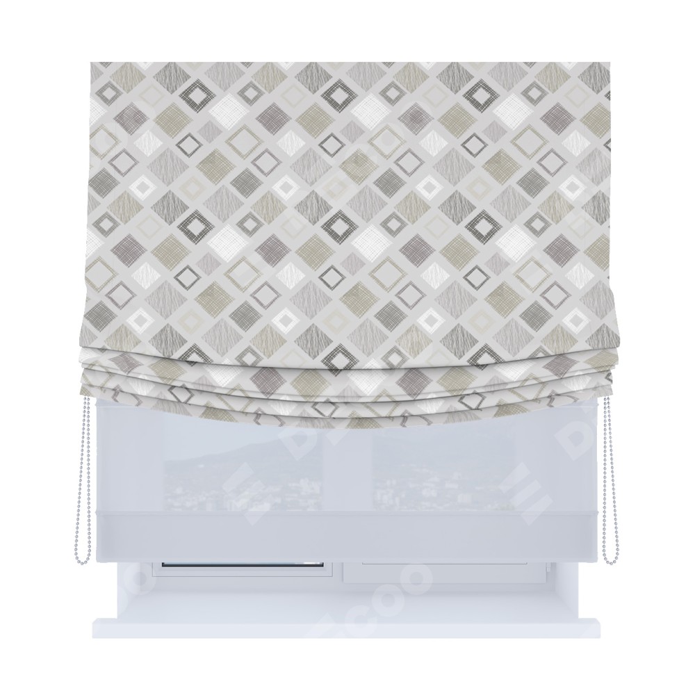 Римская штора день-ночь производителя «Cortin», используется для проёма, пошита из двух полотен, с лицевой блэкаут с нанесением сублимационной печати «Квадро», вторая ткань тюль (по стандарту комплектуется тюль белого цвета артикул V-01). Имеет универсальный механизм и подходит для монтажа: на потолок, на стену и в нишу. Удобное управление каждой шторой отдельно.