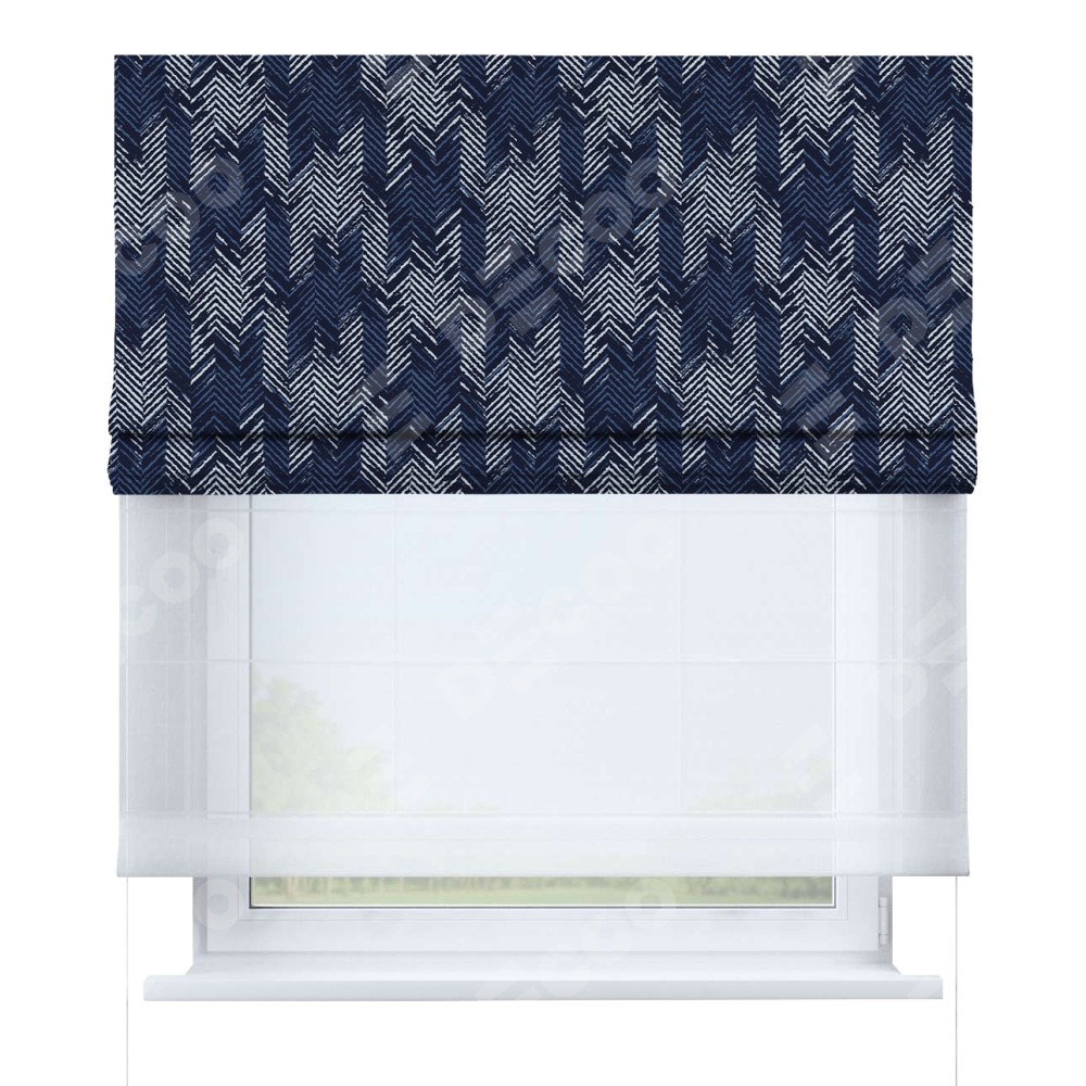 Двойная римская штора «День-ночь» от производителя Cortin предназначена для использования в проёмах. Эта штора уникальна тем, что состоит из двух полотен. На лицевой стороне находится блэкаут с нанесением сублимационной печати «Пёстрый зигзаг», обеспечивающий эффективное затемнение. В комплект также входит вторая ткань — легкий белый тюль (артикул: V-01), который добавляет изящества и легкости оформлению окна. Кроме того, доступны и другие разновидности ткани тюль, выбор которых доступен по  ссылке .