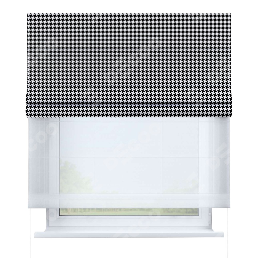 Двойная римская штора «День-ночь» от производителя Cortin предназначена для использования в проёмах. Эта штора уникальна тем, что состоит из двух полотен. На лицевой стороне находится блэкаут с нанесением сублимационной печати «Гусиные лапки» черно-белый», обеспечивающий эффективное затемнение. В комплект также входит вторая ткань — легкий белый тюль (артикул: V-01), который добавляет изящества и легкости оформлению окна. Кроме того, доступны и другие разновидности ткани тюль, выбор которых доступен по ссылке .