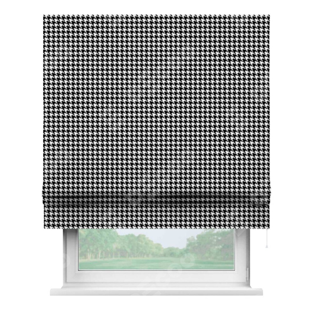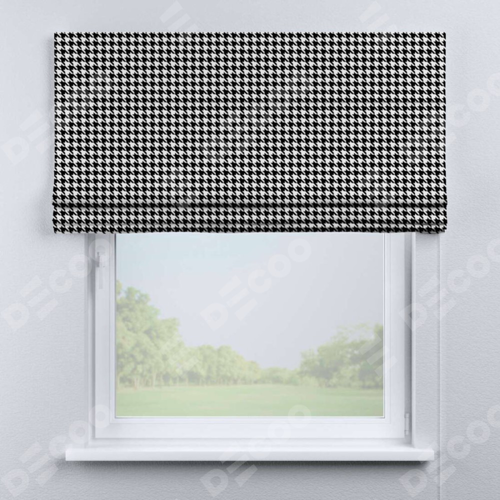 Классическая римская штора производителя «Cortin», пошита из ткани блэкаут с нанесением сублимационной печати «Гусиные лапки» черно-белый». Имеет универсальный механизм и подходит для монтажа: на потолок, на стену и в нишу.