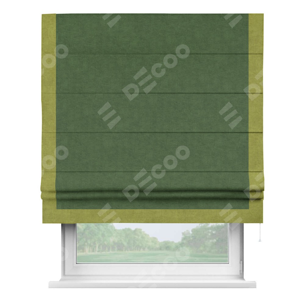 Римская штора производителя «Cortin», используется для проёма, пошита из ткани канвас зелёный, артикул ткани v-16. Отделка шторы кантом «Виктория» (зелёное яблоко v-370), ткань для канта используется из канваса разной расцветки на выбор. Имеет универсальный механизм и подходит для монтажа: на потолок, на стену и в нишу.