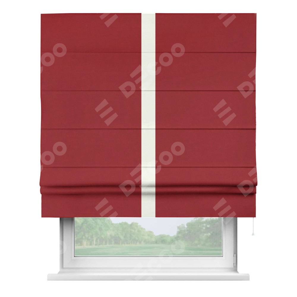 Римская штора производителя «Cortin», используется для проёма, пошита из ткани канвас красный, артикул ткани v-113. Отделка шторы кантом «Хайвей» (молочный v-93), ткань для канта используется из канваса разной расцветки на выбор. Имеет универсальный механизм и подходит для монтажа: на потолок, на стену и в нишу.