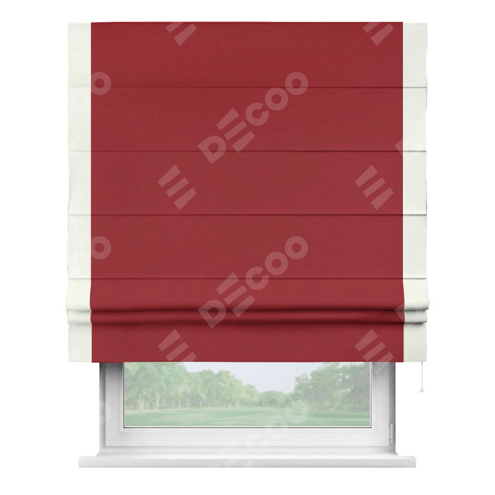 Римская штора производителя «Cortin», используется для проёма, пошита из ткани канвас красный, артикул ткани v-113. Отделка шторы кантом «Стрим Дуо» (молочный v-93), ткань для канта используется из канваса разной расцветки на выбор. Имеет универсальный механизм и подходит для монтажа: на потолок, на стену и в нишу.
