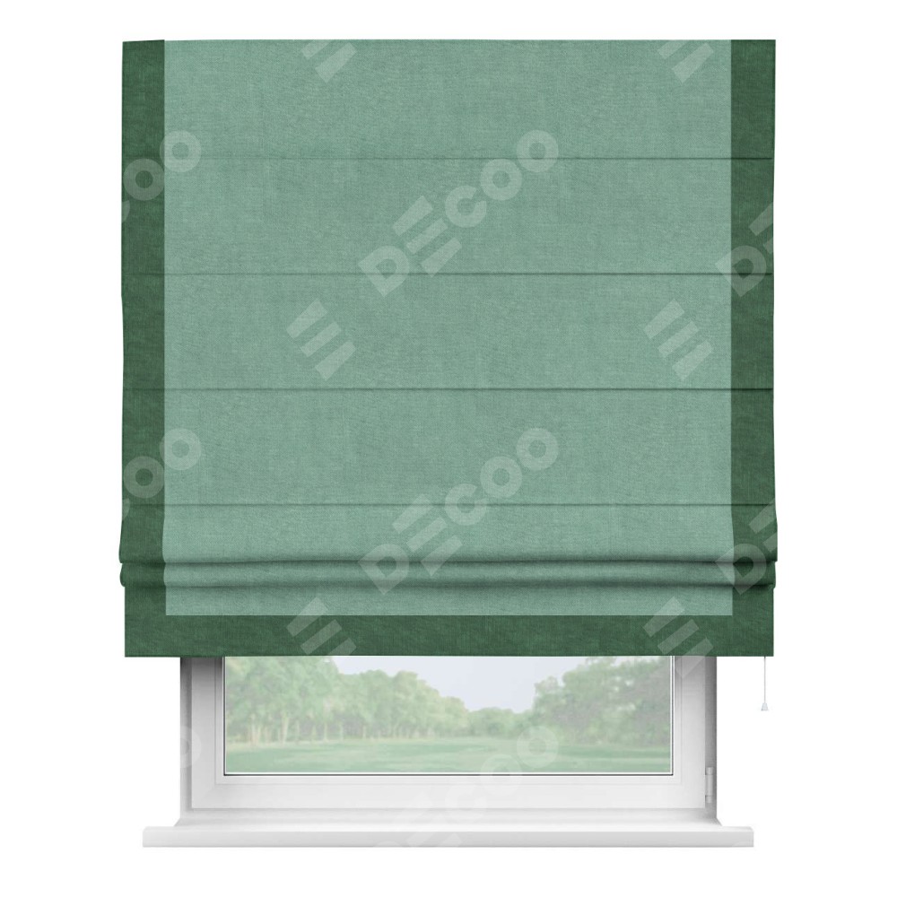 Римская штора производителя «Cortin», используется для проёма, пошита из ткани канвас мятный, артикул ткани v-248. Отделка шторы кантом «Виктория» (тёмно-зелёный v-469), ткань для канта используется из канваса разной расцветки на выбор. Имеет универсальный механизм и подходит для монтажа: на потолок, на стену и в нишу.