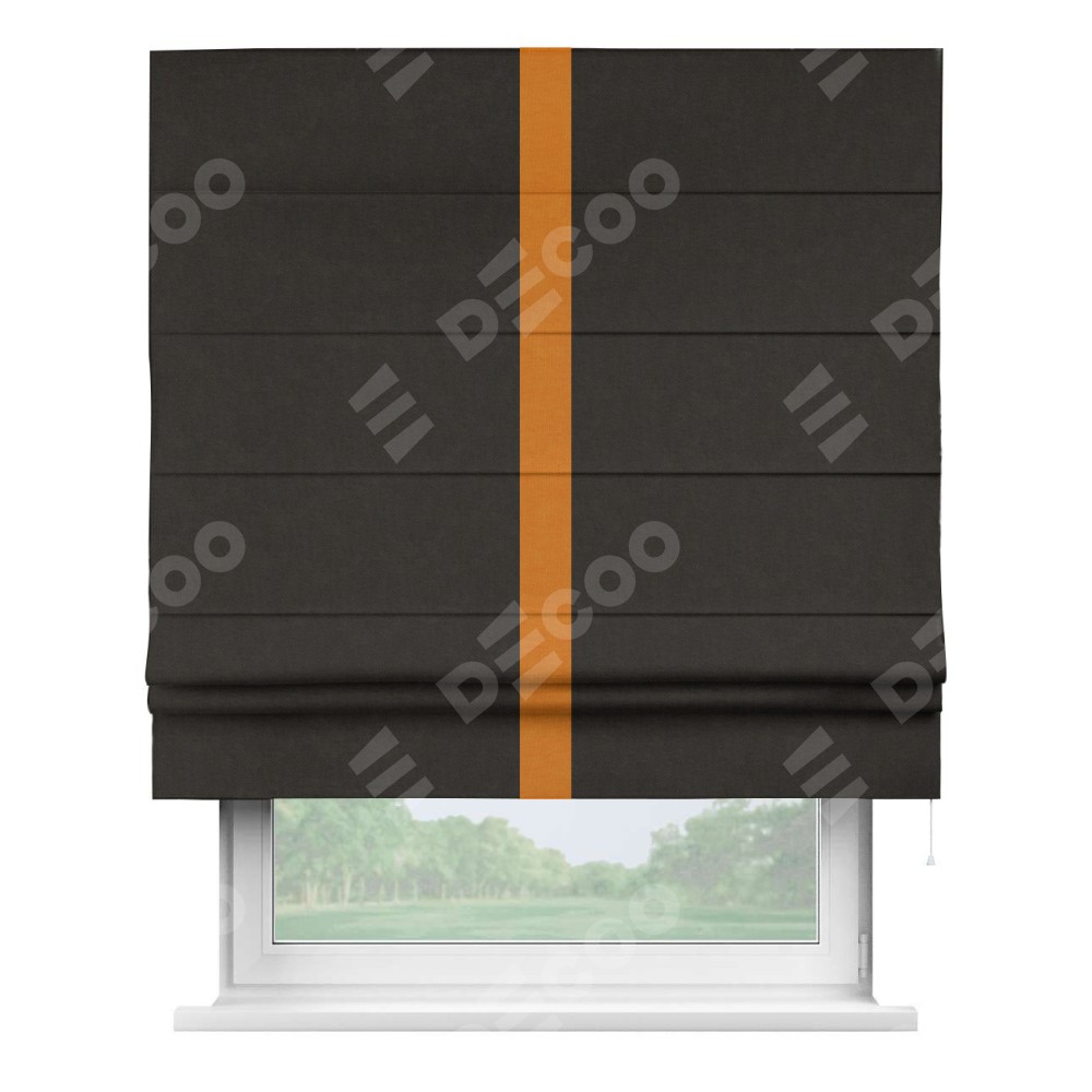 Римская штора производителя «Cortin», используется для проёма, пошита из ткани канвас тёмно-коричневый, артикул ткани v-13. Отделка шторы кантом «Хайвей» (оранжевый v-106), ткань для канта используется из канваса разной расцветки на выбор. Имеет универсальный механизм и подходит для монтажа: на потолок, на стену и в нишу.