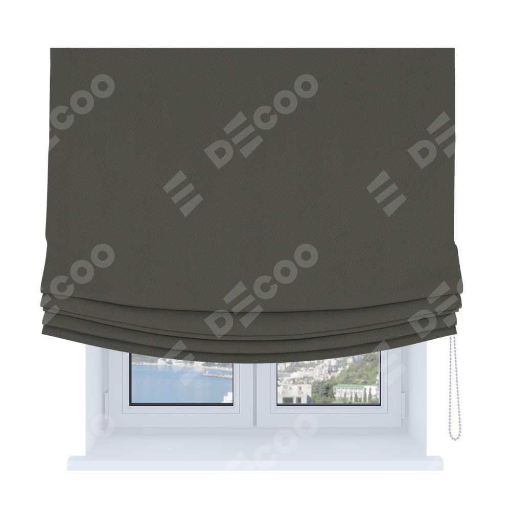 Римская штора Soft производителя «Cortin», используется для проёма, пошита из ткани блэкаут однотонный тёмно-серый, артикул ткани 91570. Имеет универсальный механизм и подходит для монтажа: на потолок, на стену и в нишу. В отличие от стандартных римских штор, римская штора Soft не имеет горизонтальных вставок и нижнего отвеса. Это позволяет ткани произвольно драпироваться в свободные мягкие складки.