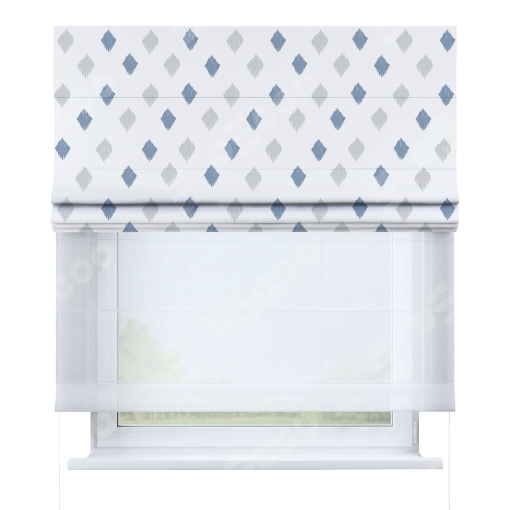 Двойная римская штора «День-ночь» от производителя Cortin предназначена для использования в проёмах. Эта штора уникальна тем, что состоит из двух полотен. На лицевой стороне находится блэкаут с нанесением сублимационной печати «Икат ромбики», обеспечивающий эффективное затемнение. В комплект также входит вторая ткань — легкий белый тюль (артикул: V-01), который добавляет изящества и легкости оформлению окна. Кроме того, доступны и другие разновидности ткани тюль, выбор которых доступен по  ссылке .