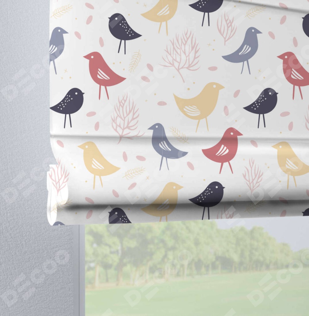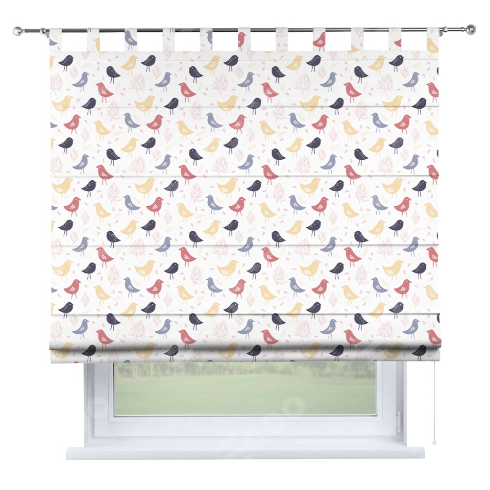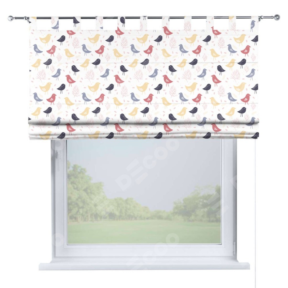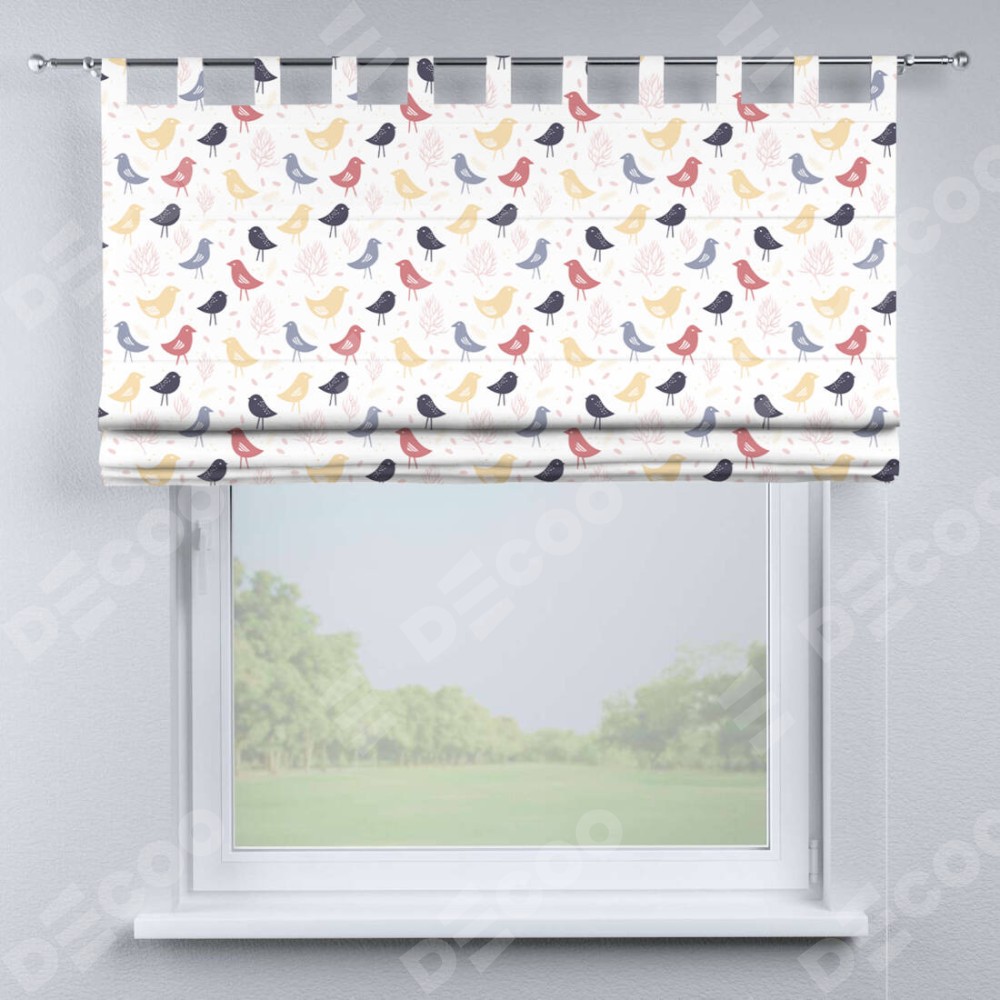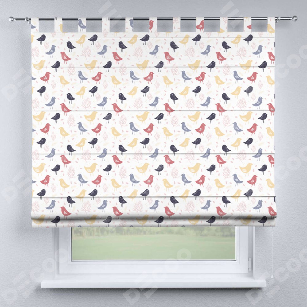 Римская штора производителя «Cortin», используется для проёма, пошита из ткани блэкаут с нанесением сублимационной печати «Цветные птички». Данная модель пошита на петлях, комплектуется на выбор круглым карнизом и подходит для монтажа на стену. Римская штора на петлях имеет простую систему регулировки высоты, отличительным преимуществом данной модели является простой способ монтажа. Достаточно повесить ее на трубу и штора готова!