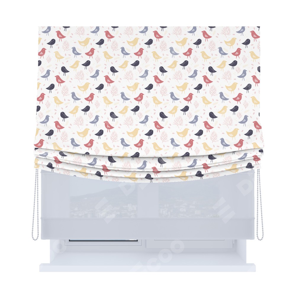 Римская штора день-ночь производителя «Cortin», используется для проёма, пошита из двух полотен, с лицевой блэкаут с нанесением сублимационной печати «Цветные птички», вторая ткань тюль (по стандарту комплектуется тюль белого цвета артикул V-01). Имеет универсальный механизм и подходит для монтажа: на потолок, на стену и в нишу. Удобное управление каждой шторой отдельно.