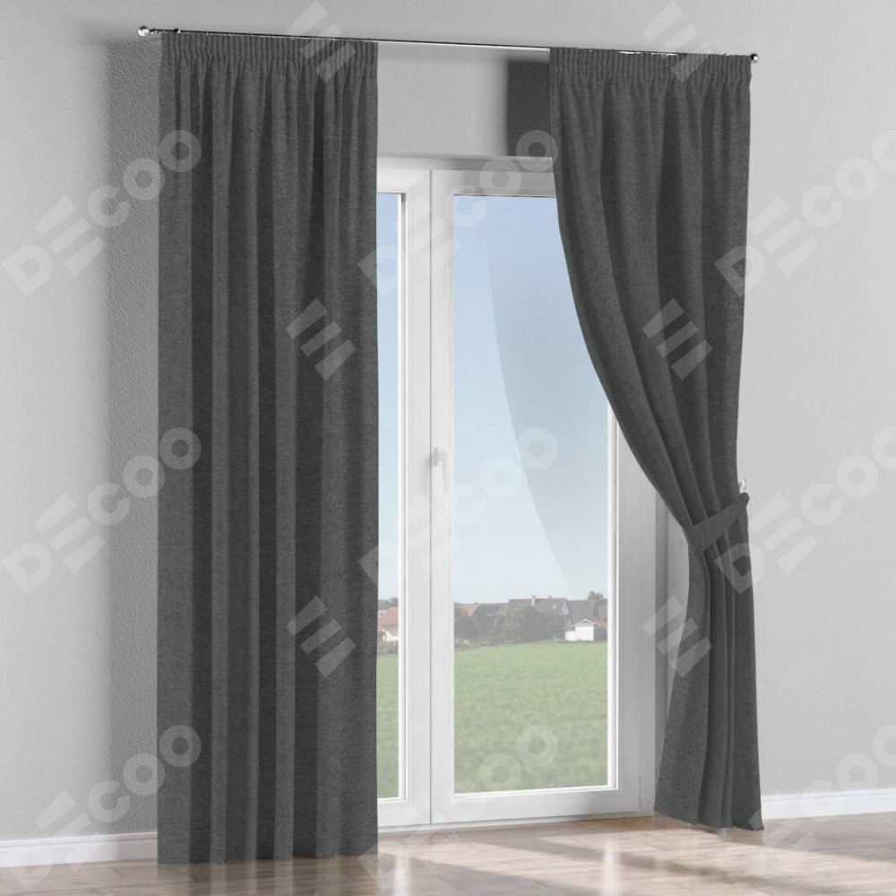 Комплект прямых штор, от производителя «Cortin», пошиты из ткани твид блэкаут тёмно-серый, артикул ткани 90938. С изнаночной стороны в верхней части штор пристрачивается шторная лента с декоративными складками «Карандаш». Для создания элегантных складок прямые шторы шьются по стандарту с коэффициентом 1:2 (на 100 см. ширины проёма 200 см. ширины ткани).