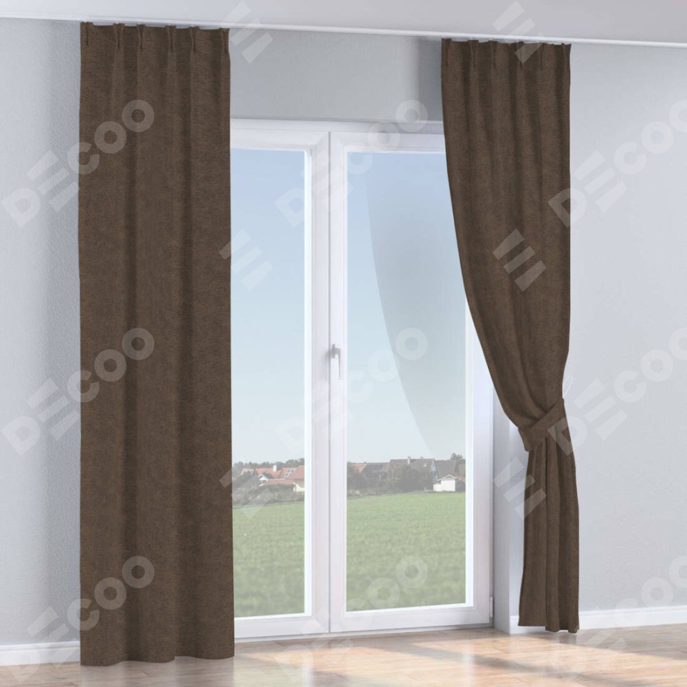 Комплект прямых штор, от производителя «Cortin», пошиты из ткани твид блэкаут тёмно-коричневый, артикул ткани 90933. С изнаночной стороны в верхней части штор пристрачивается шторная лента с декоративными складками «Кустик». Для создания элегантных складок прямые шторы шьются по стандарту с коэффициентом 1:2 (на 100 см. ширины проёма 200 см. ширины ткани).