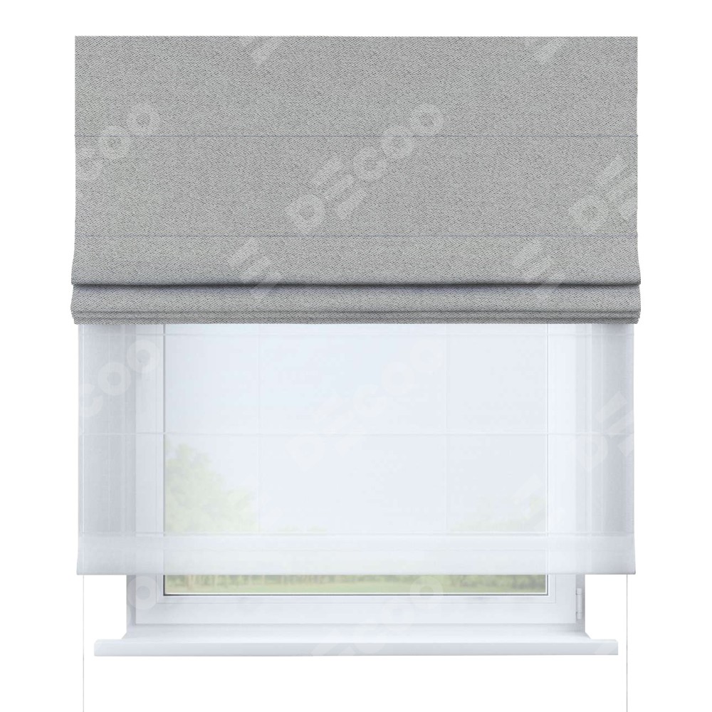 Двойная римская штора «День-ночь» от производителя Cortin предназначена для использования в проёмах. Эта штора уникальна тем, что состоит из двух полотен. На лицевой стороне находится твид блэкаут светло-серый (артикул: 90936), обеспечивающий эффективное затемнение. В комплект также входит вторая ткань — легкий белый тюль (артикул: V-01), который добавляет изящества и легкости оформлению окна. Кроме того, доступны и другие разновидности ткани тюль, выбор которых доступен по  ссылке .