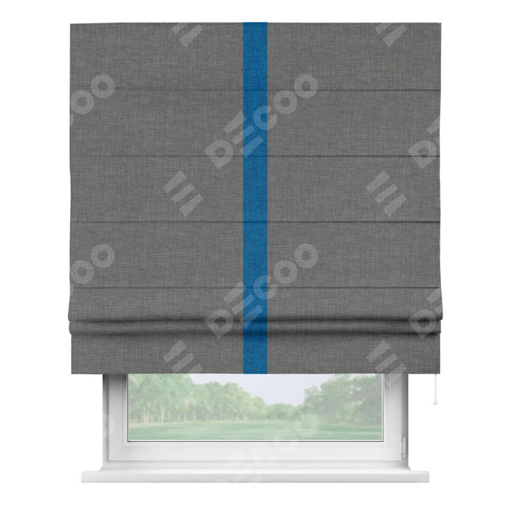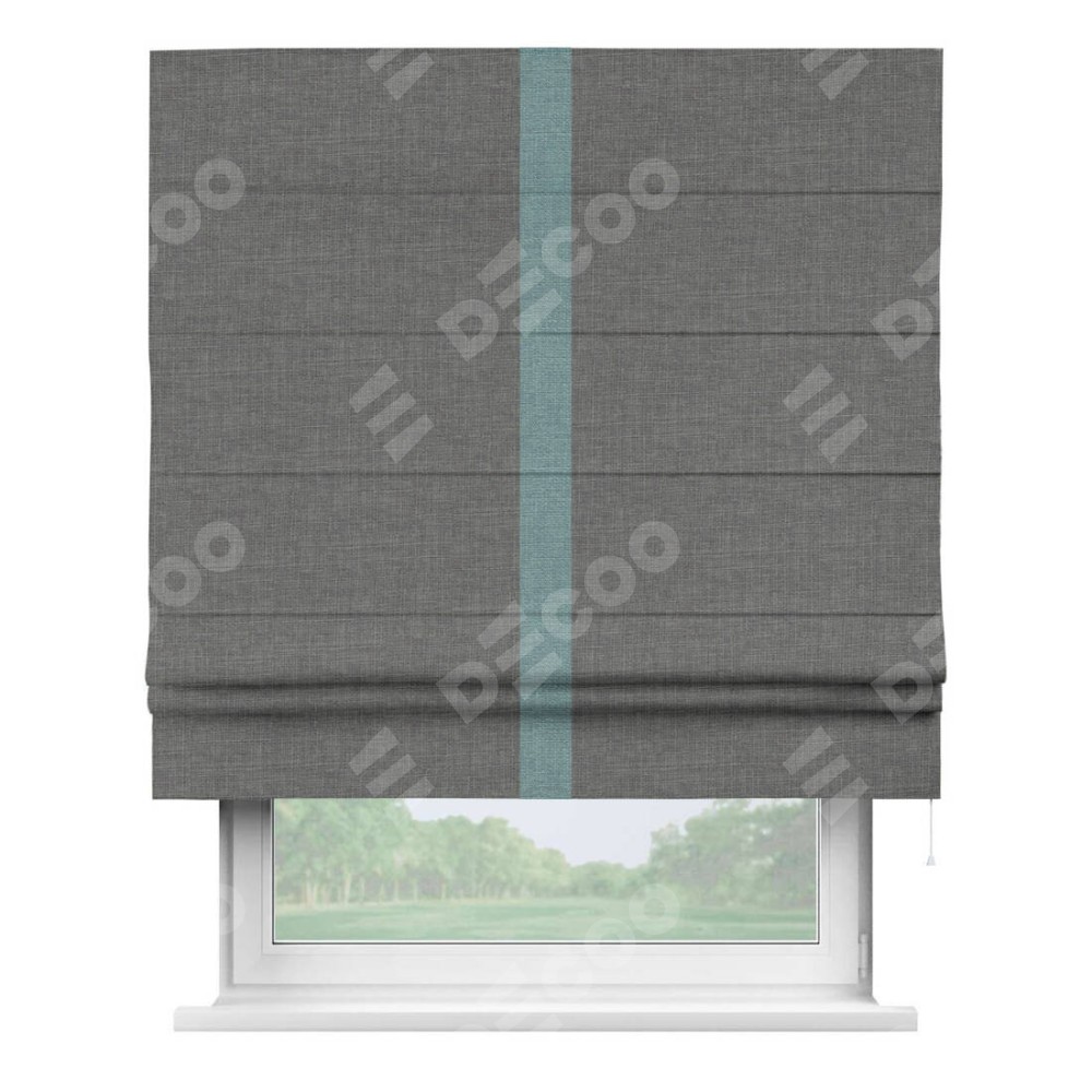 Римская штора производителя «Cortin», используется для проёма, пошита из ткани лён тёмно-серый, артикул 7441. Отделка шторы кантом «Хайвэй», ткань для канта используется из льна разной расцветки на выбор. Имеет универсальный механизм и подходит для монтажа: на потолок, на стену и в нишу.