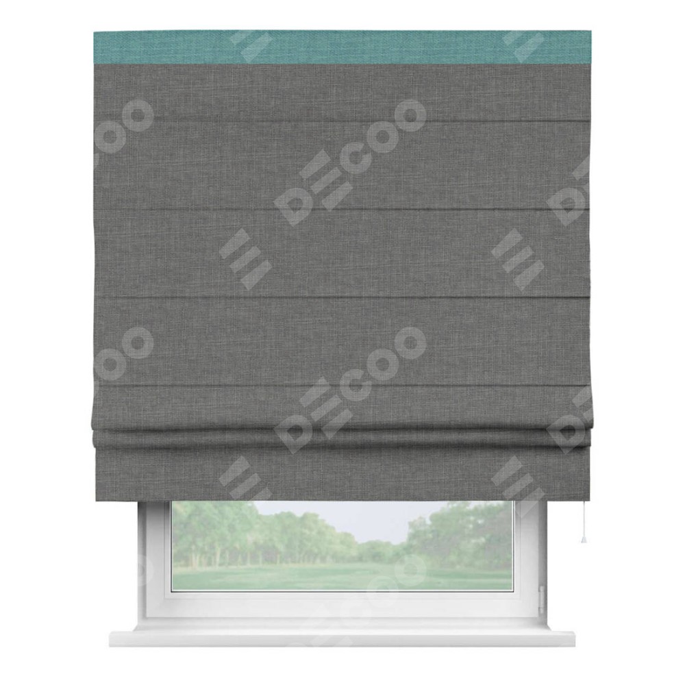 Римская штора производителя «Cortin», используется для проёма, пошита из ткани лён тёмно-серый, артикул 7441. Отделка шторы кантом «Кинг», ткань для канта используется из льна разной расцветки на выбор. Имеет универсальный механизм и подходит для монтажа: на потолок, на стену и в нишу.