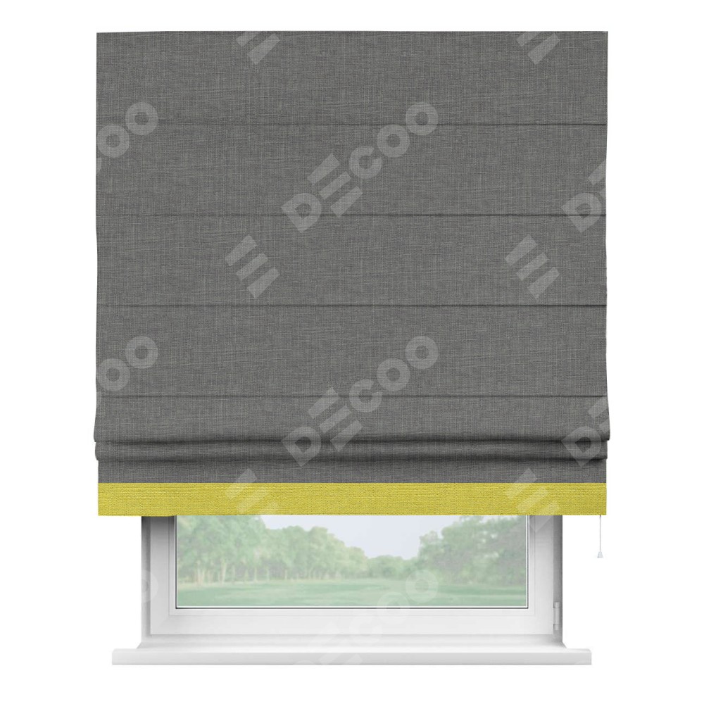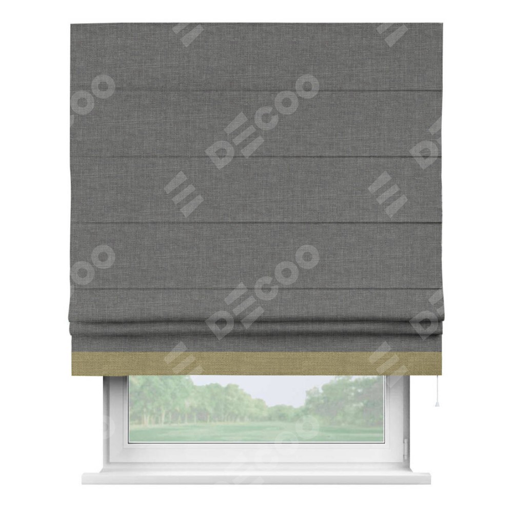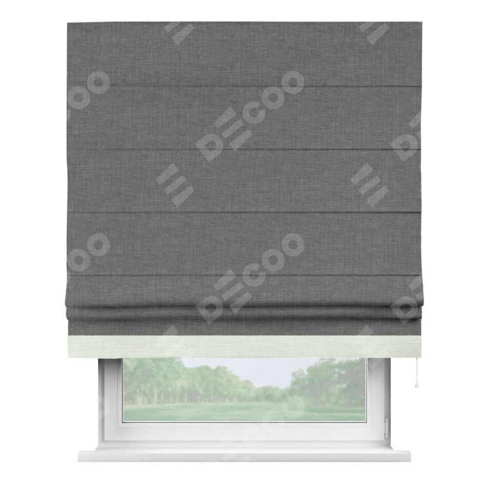 Римская штора производителя «Cortin», используется для проёма, пошита из ткани лён тёмно-серый, артикул 7441. Отделка шторы кантом «Джестер», ткань для канта используется из льна разной расцветки на выбор. Имеет универсальный механизм и подходит для монтажа: на потолок, на стену и в нишу.