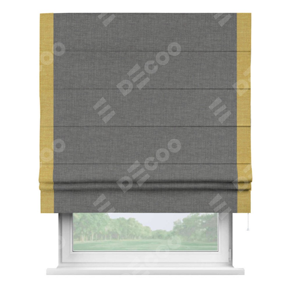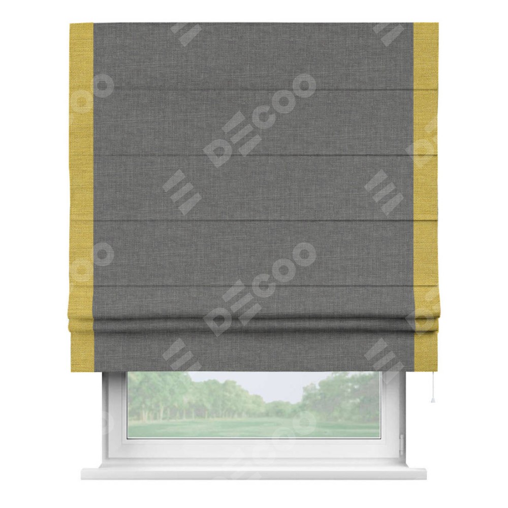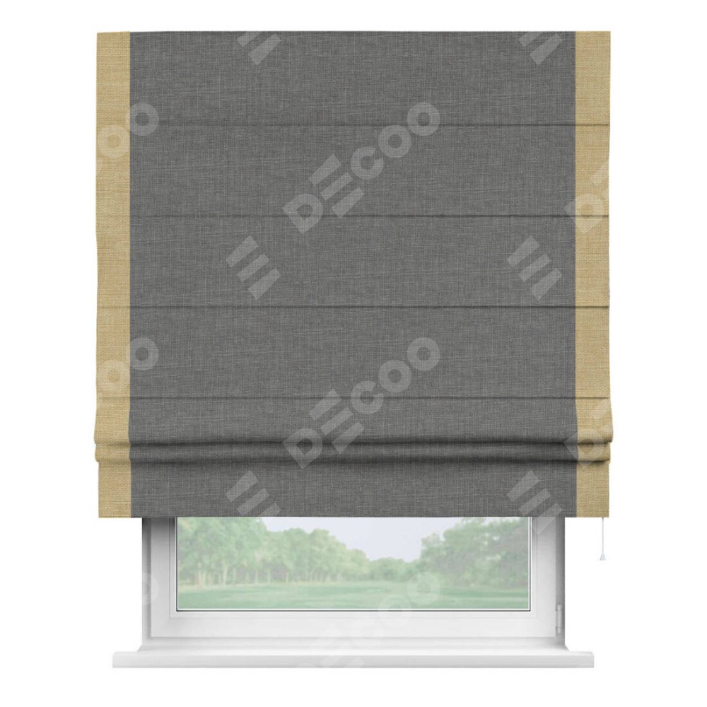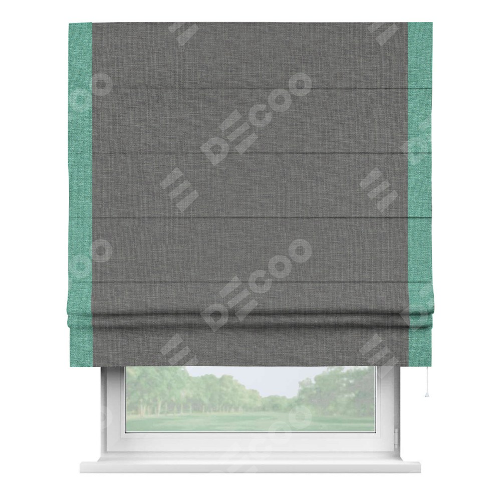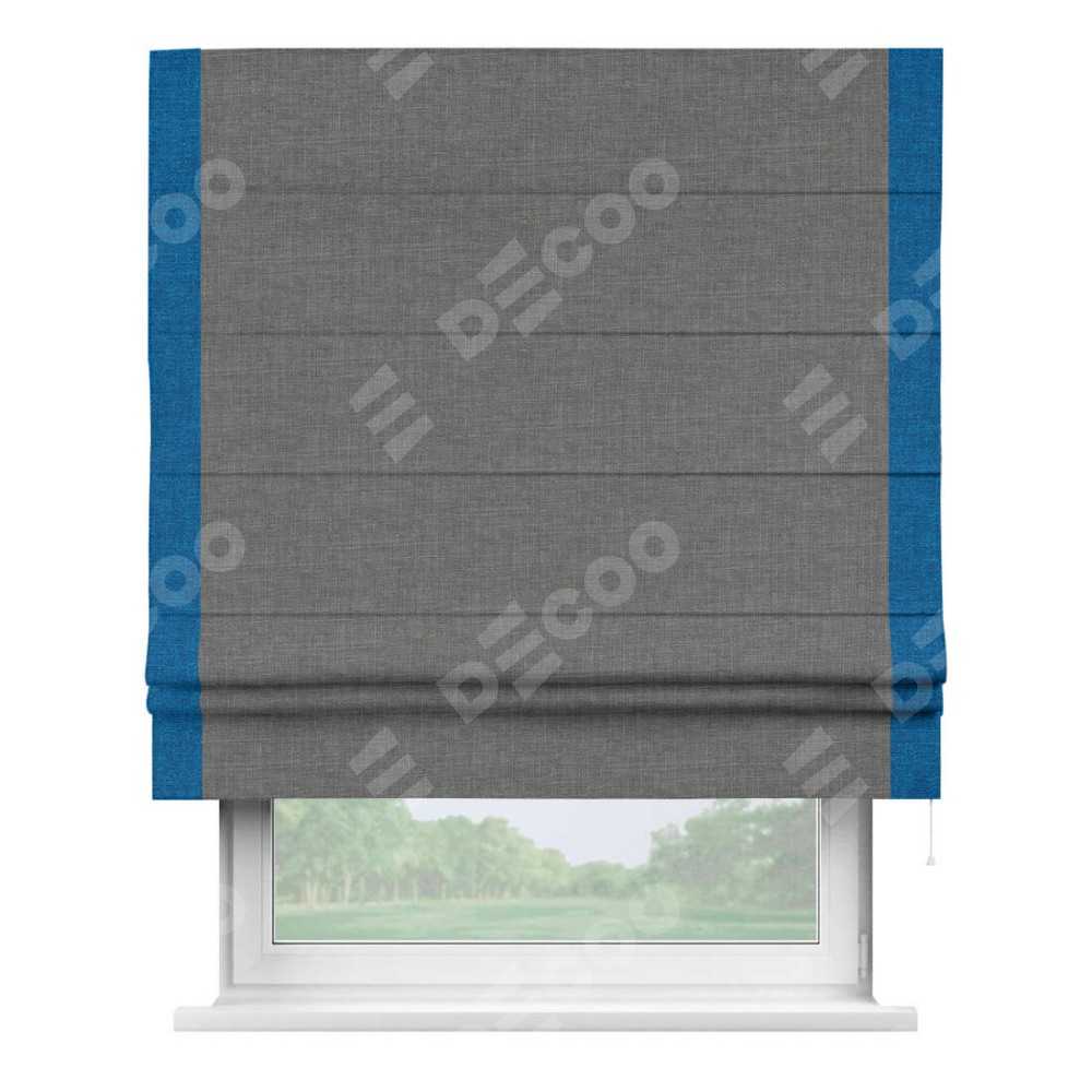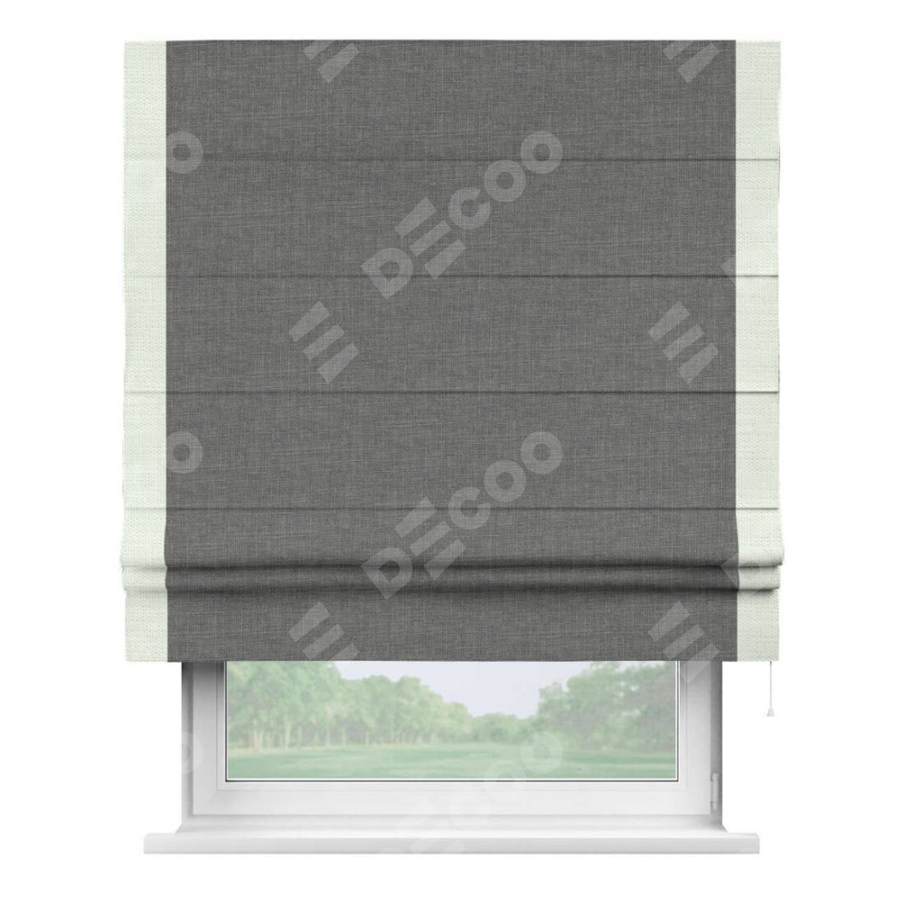 Римская штора производителя «Cortin», используется для проёма, пошита из ткани лён тёмно-серый, артикул 7441. Отделка шторы кантом «Стрим Дуо», ткань для канта используется из льна разной расцветки на выбор. Имеет универсальный механизм и подходит для монтажа: на потолок, на стену и в нишу.