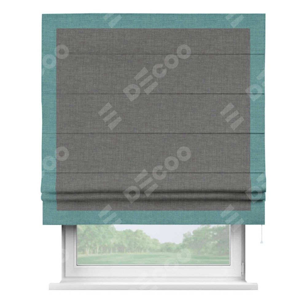 Римская штора производителя «Cortin», используется для проёма, пошита из ткани лён тёмно-серый, артикул 7441. Отделка шторы кантом «Чесс», ткань для канта используется из льна разной расцветки на выбор. Имеет универсальный механизм и подходит для монтажа: на потолок, на стену и в нишу.