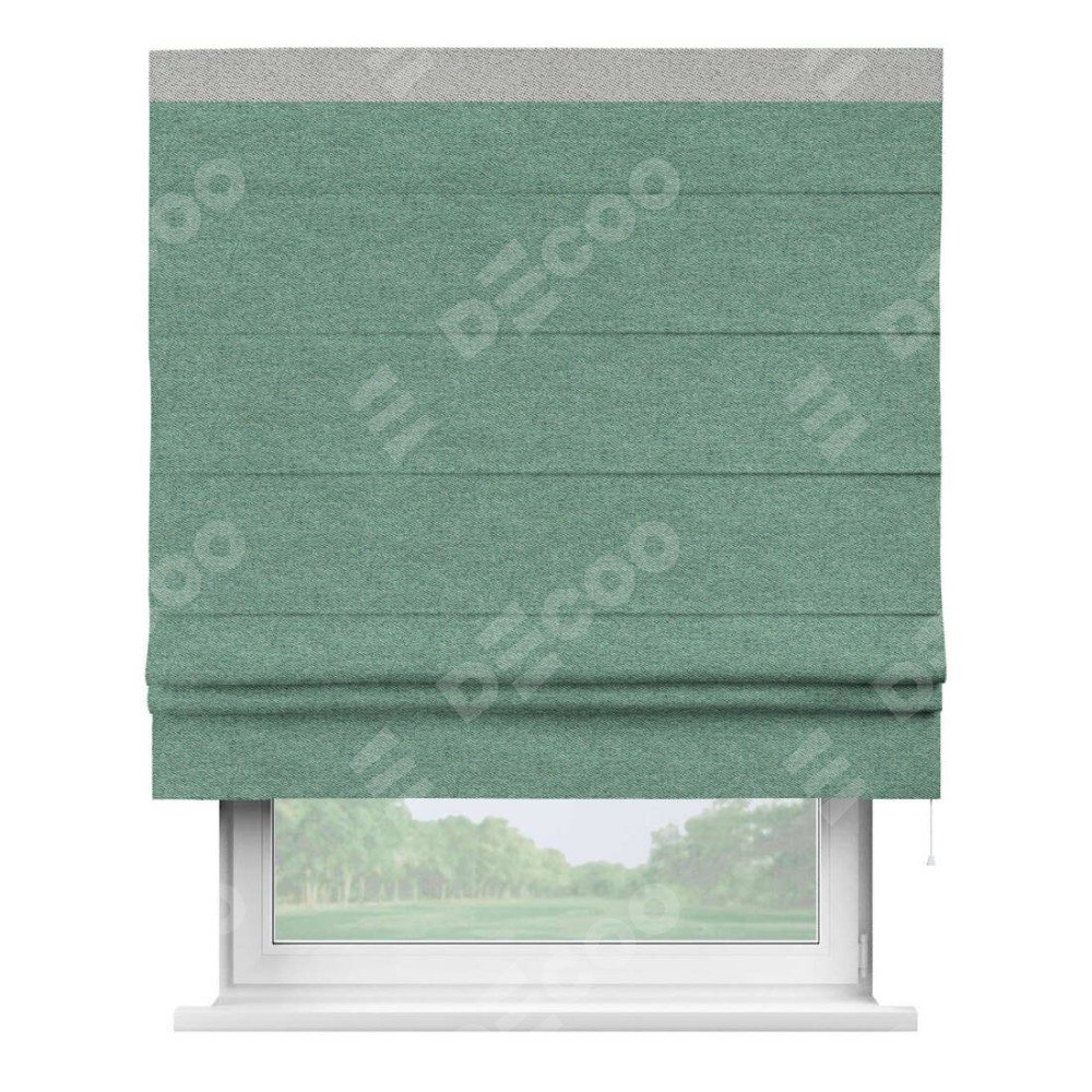 Римская штора производителя «Cortin», используется для проёма, пошита из ткани твид блэкаут бирюзовый, артикул 90934. Отделка шторы кантом «Кинг», ткань для канта используется из твида разной расцветки на выбор. Имеет универсальный механизм и подходит для монтажа: на потолок, на стену и в нишу.