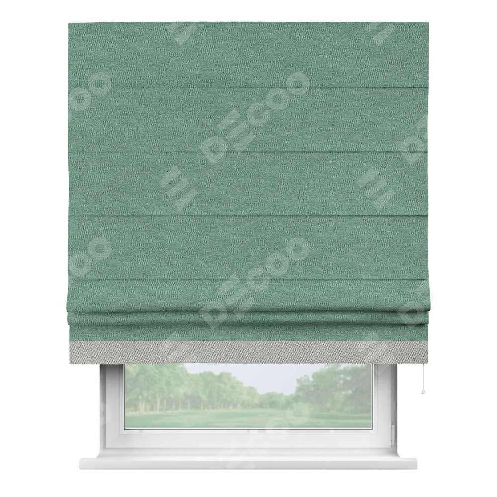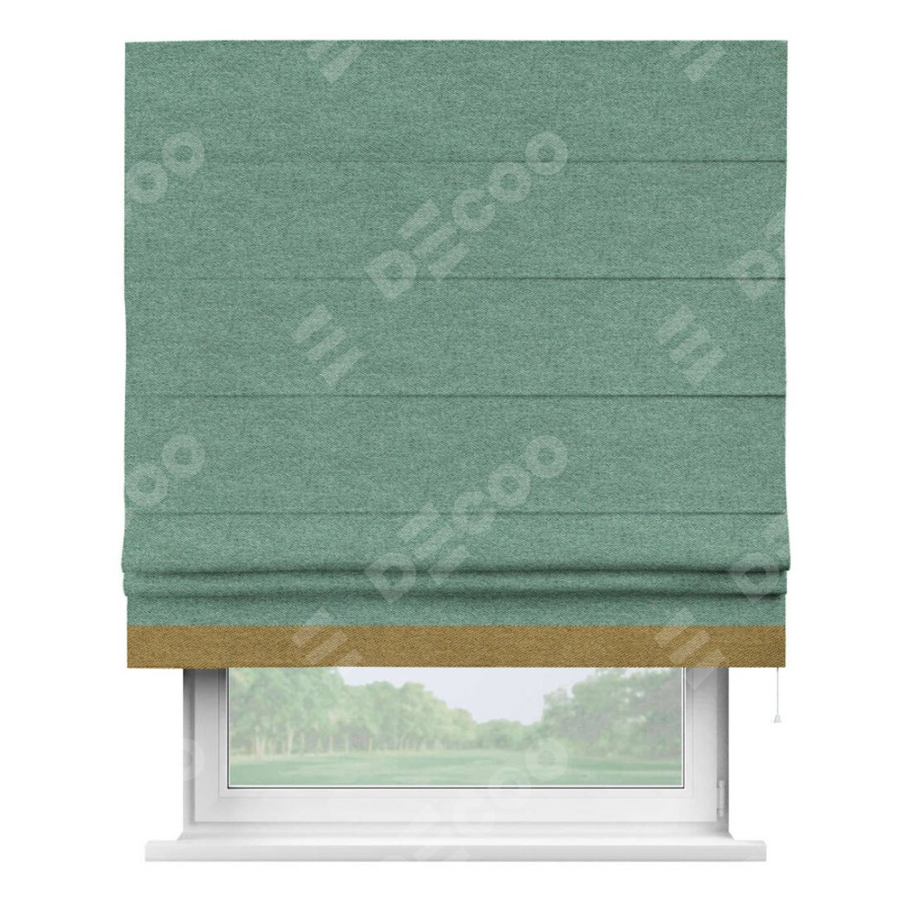 Римская штора производителя «Cortin», используется для проёма, пошита из ткани твид блэкаут бирюзовый, артикул 90934. Отделка шторы кантом «Джестер», ткань для канта используется из твида разной расцветки на выбор. Имеет универсальный механизм и подходит для монтажа: на потолок, на стену и в нишу.