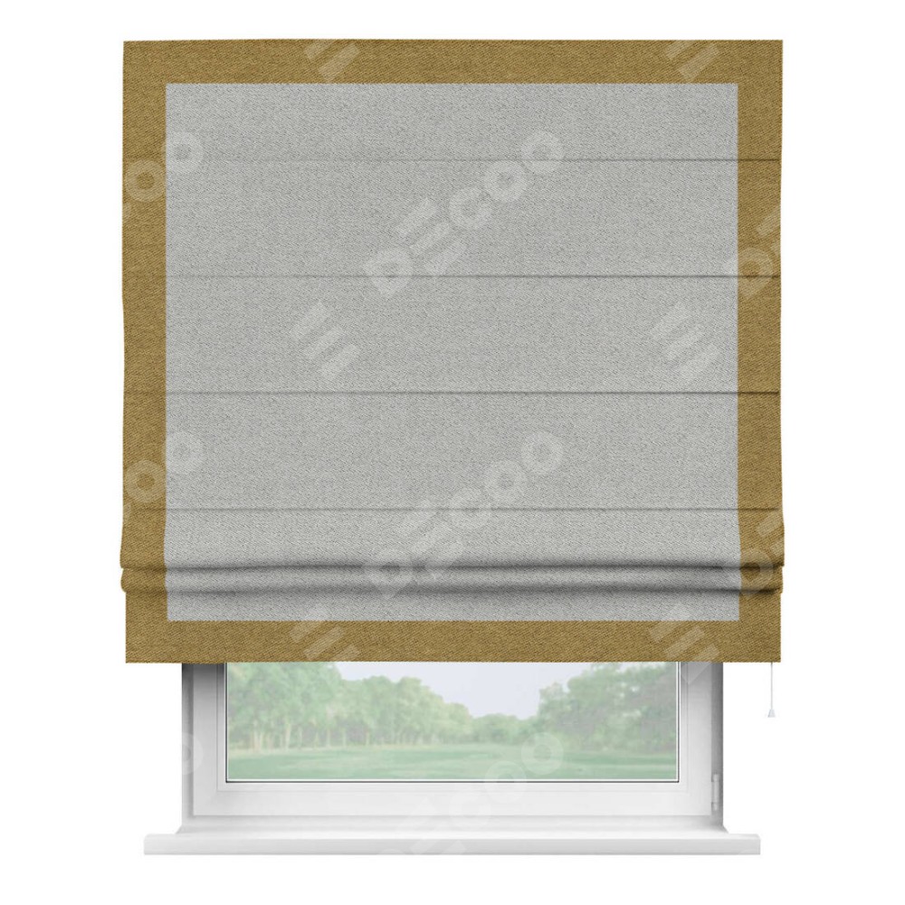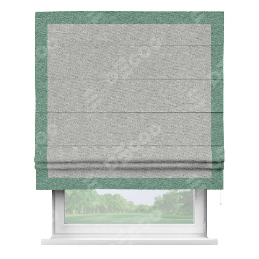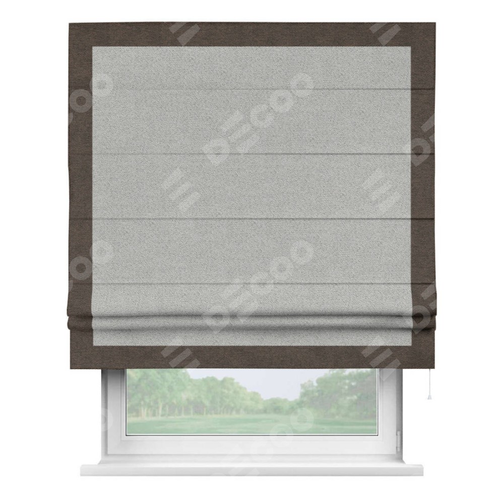 Римская штора производителя «Cortin», используется для проёма, пошита из ткани твид блэкаут светло-серый, артикул 90936. Отделка шторы кантом «Чесс», ткань для канта используется из твида разной расцветки на выбор. Имеет универсальный механизм и подходит для монтажа: на потолок, на стену и в нишу.