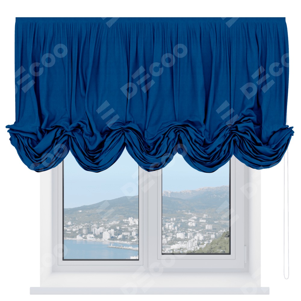Австрийская штора производителя «Cortin», используется для проёма, пошита из ткани вельвет синий, артикул ткани 85554. Имеет универсальный механизм и подходит для монтажа: на потолок и на стену.