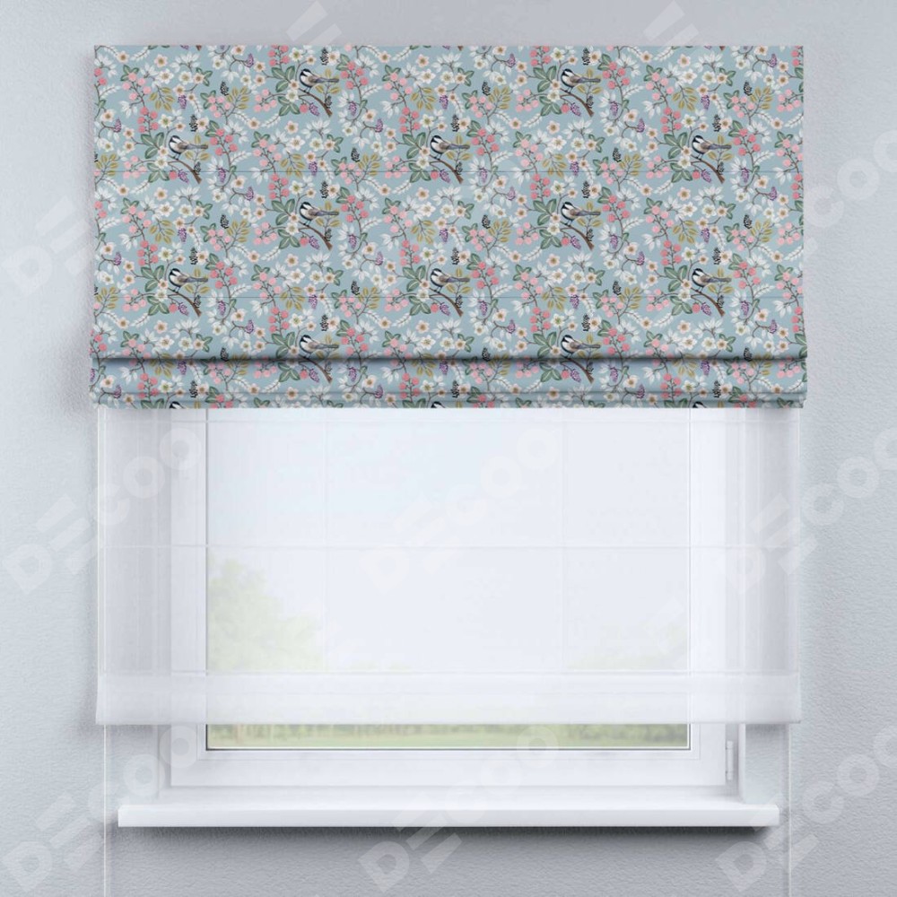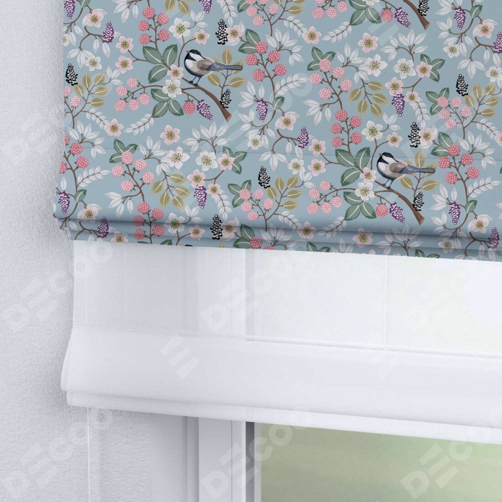 Двойная римская штора «День-ночь» от производителя Cortin предназначена для использования в проёмах. Эта штора уникальна тем, что состоит из двух полотен. На лицевой стороне находится блэкаут с нанесением сублимационной печати «Ежевичное утро», обеспечивающий эффективное затемнение. В комплект также входит вторая ткань — легкий белый тюль (артикул: V-01), который добавляет изящества и легкости оформлению окна. Кроме того, доступны и другие разновидности ткани тюль, выбор которых доступен по  ссылке .