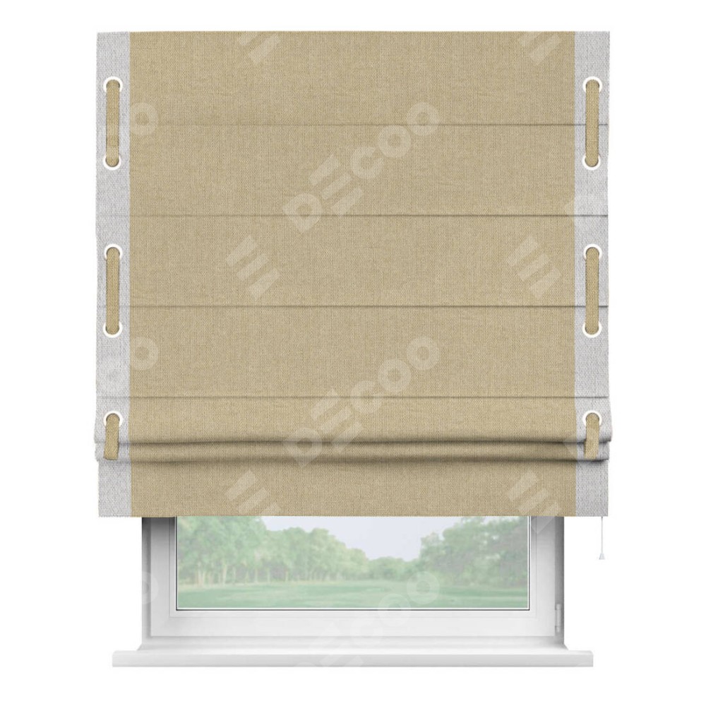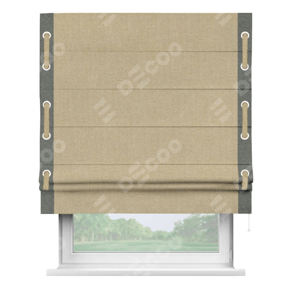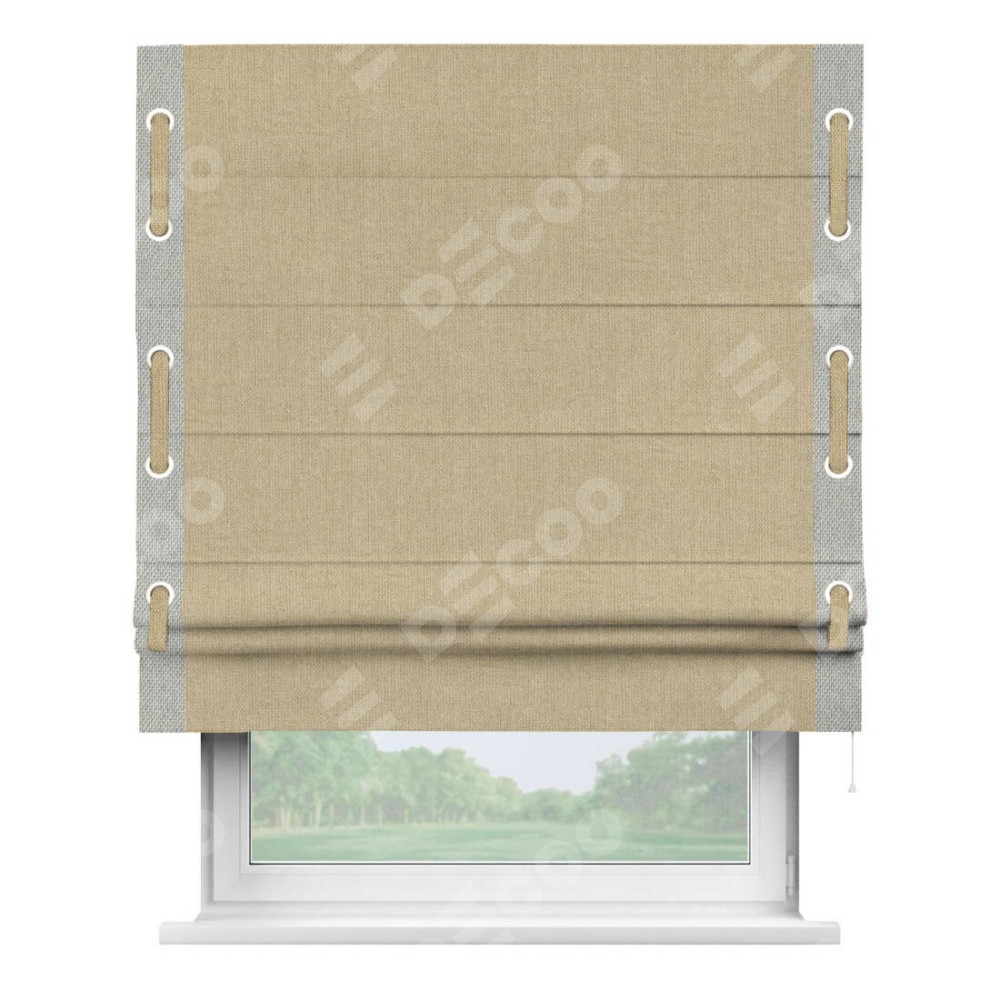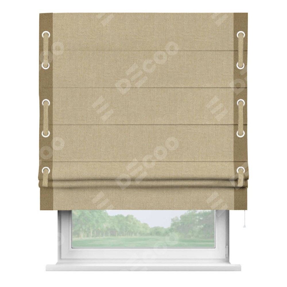 Римская штора пошита из ткани лён димаут песочный, артикул: 16256, с отделкой кантом «Стрим Дуо», дополненная декоративными люверсами на этих кантах и протянутым пояском из основного цвета римской шторы, представляет собой высоко декоративное и функциональное решение для оконного оформления. Канты, расположенные по обеим боковым сторонам шторы, уже добавляют изысканности и завершенности внешнему виду. Добавление люверсов и пояска не только усиливает декоративный эффект, но и придает шторе дополнительную текстурность и глубину.