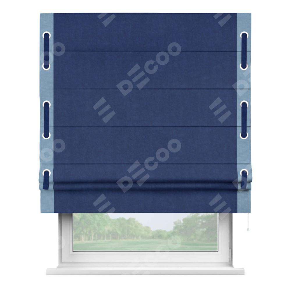 Если у вас уже установлена наша штора, то вам не обязательно снова покупать весь продукт — вы можете легко купить и заменить только ткань. Новая ткань доступна для заказа на нашем сайте, и её замена не требует особых усилий, позволяя вам экономить и обновлять ваш интерьер без лишних расходов. Римская штора производителя «Cortin», используется для проёма, пошита из ткани канвас синий, артикул ткани v-573. Отделка шторы кантом «Стрим Дуо» на кантах расположены люверсы с пояском, ткань для канта используется из вельвета разной расцветки на выбор. Ткань для пояска обычно используется из основной ткани шторы, а так же можно сделать из любой расцветки по желанию. Имеет универсальный механизм и подходит для монтажа: на потолок, на стену и в нишу.