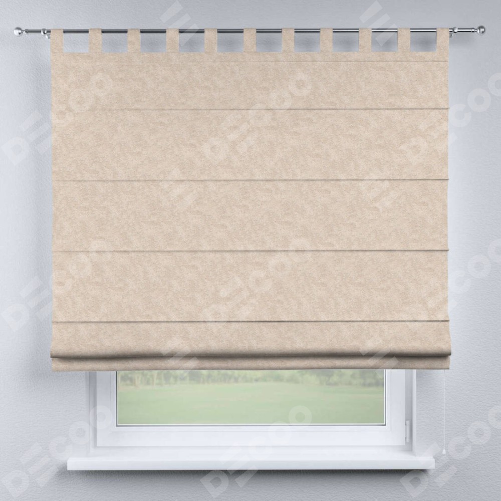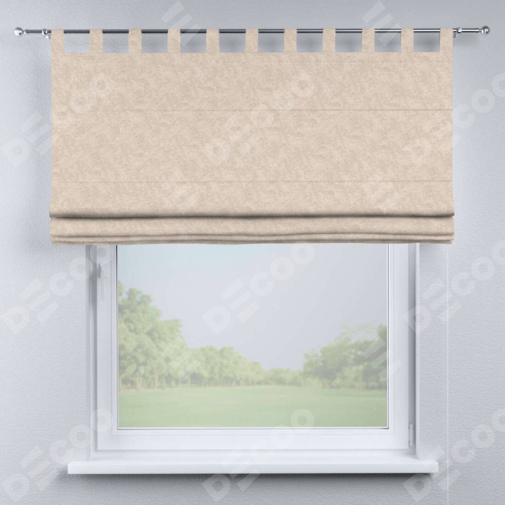 Римская штора производителя «Cortin», используется для проёма, пошита из ткани софт мрамор шампань, артикул ткани 93575. Данная модель пошита на петлях, комплектуется на выбор круглым карнизом и подходит для монтажа на стену. Римская штора на петлях имеет простую систему регулировки высоты, отличительным преимуществом данной модели является простой способ монтажа. Достаточно повесить ее на трубу и штора готова!