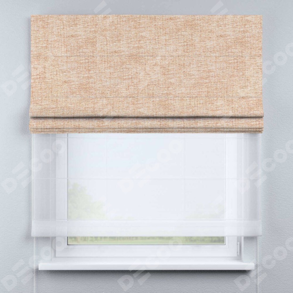Двойная римская штора «День-ночь» от производителя Cortin предназначена для использования в проёмах. Эта штора уникальна тем, что состоит из двух полотен. На лицевой стороне находится рогожка димаут персиковый (артикул: 91016), обеспечивающая комфортное затемнение. В комплект также входит вторая ткань — легкий белый тюль (артикул: V-01), который добавляет изящества и легкости оформлению окна. Кроме того, доступны и другие разновидности ткани тюль, выбор которых доступен по  ссылке .