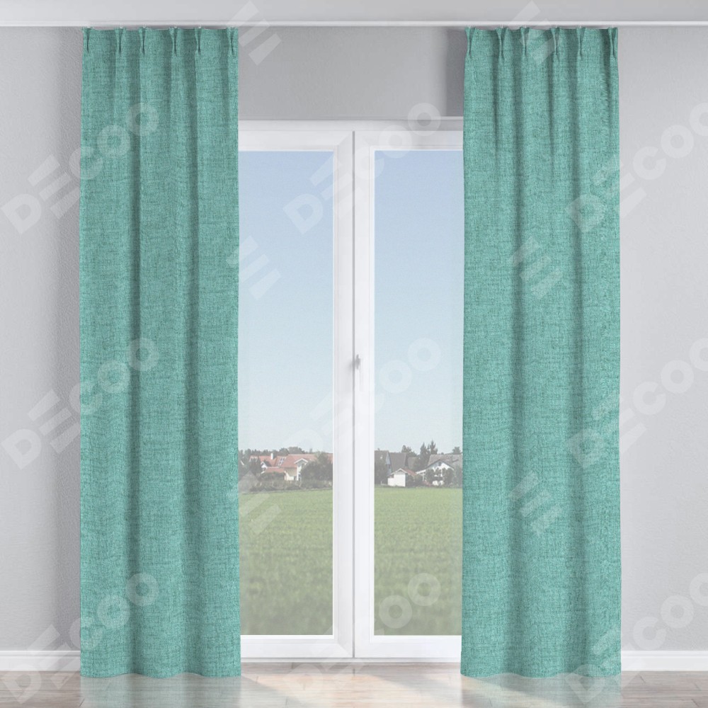 Комплект прямых штор, от производителя «Cortin», пошиты из ткани рогожка димаут аквамариновый крайола, артикул ткани 91023. С изнаночной стороны в верхней части штор пристрачивается шторная лента с декоративными складками «Кустик». Для создания элегантных складок прямые шторы шьются по стандарту с коэффициентом 1:2 (на 100 см. ширины проёма 200 см. ширины ткани).