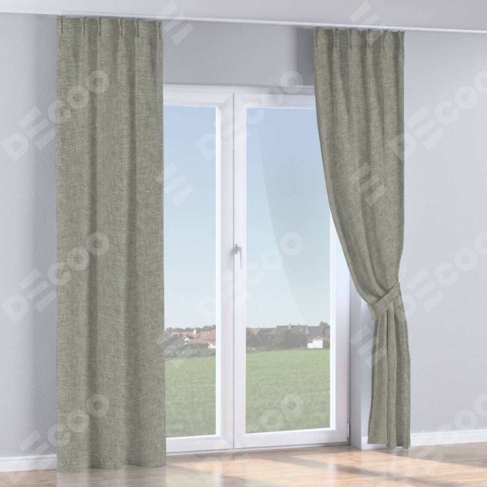 Комплект прямых штор, от производителя «Cortin», пошиты из ткани рогожка димаут серый дуб, артикул ткани 91028. С изнаночной стороны в верхней части штор пристрачивается шторная лента с декоративными складками «Кустик». Для создания элегантных складок прямые шторы шьются по стандарту с коэффициентом 1:2 (на 100 см. ширины проёма 200 см. ширины ткани).