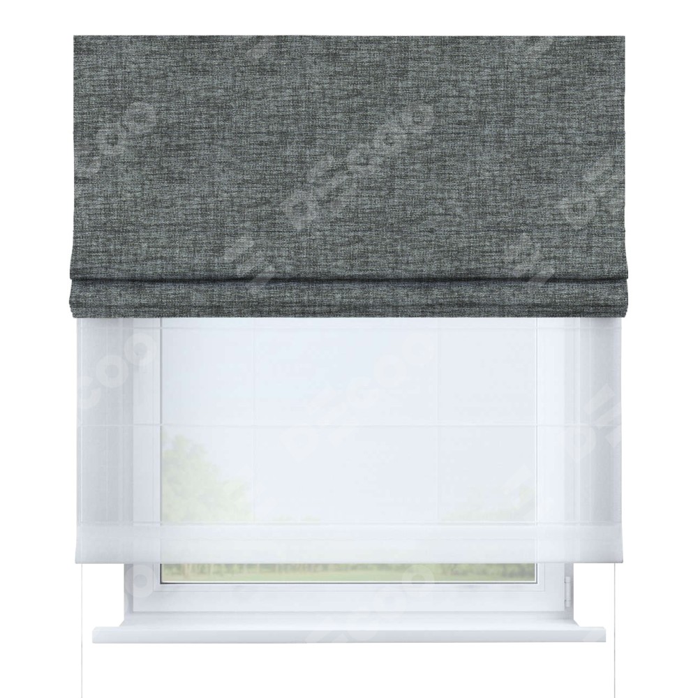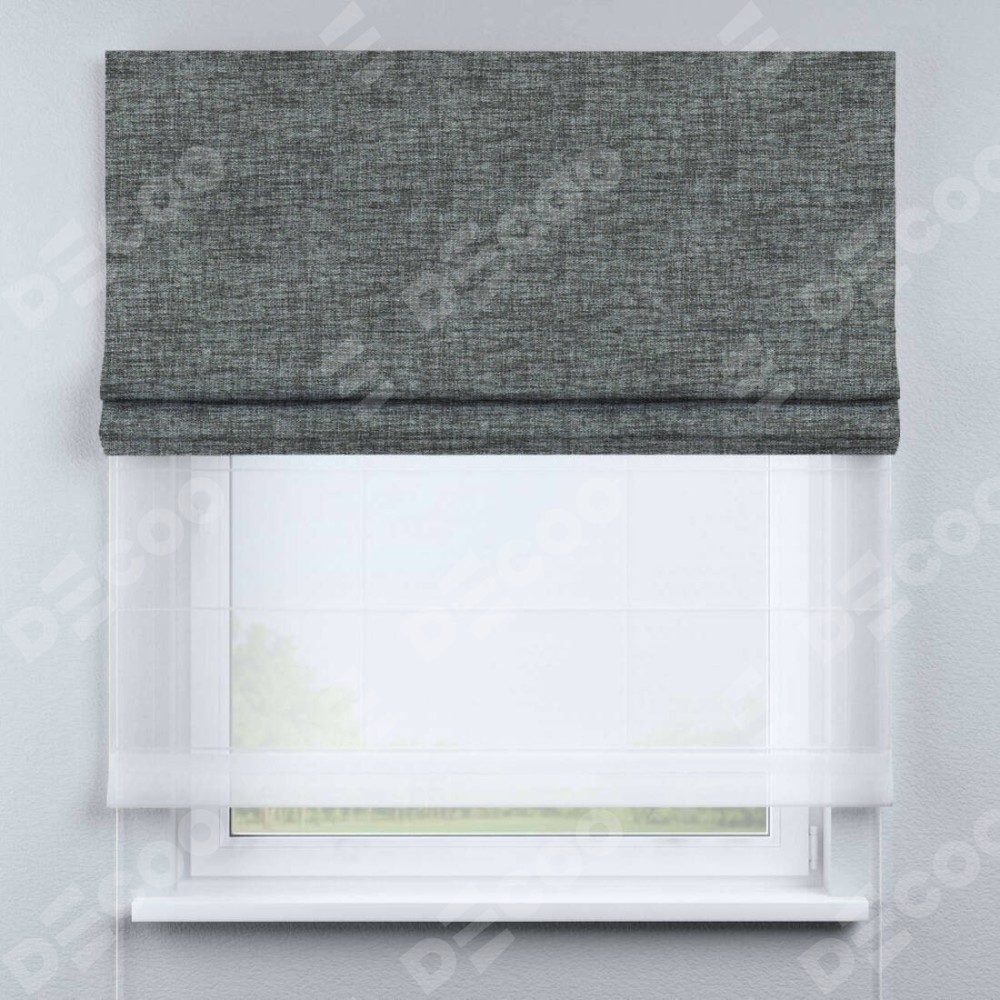 Двойная римская штора «День-ночь» от производителя Cortin предназначена для использования в проёмах. Эта штора уникальна тем, что состоит из двух полотен. На лицевой стороне находится рогожка димаут тёмно-серый (артикул: 91029), обеспечивающий эффективное затемнение. В комплект также входит вторая ткань — легкий белый тюль (артикул: V-01), который добавляет изящества и легкости оформлению окна. Кроме того, доступны и другие разновидности ткани тюль, выбор которых доступен по  ссылке .