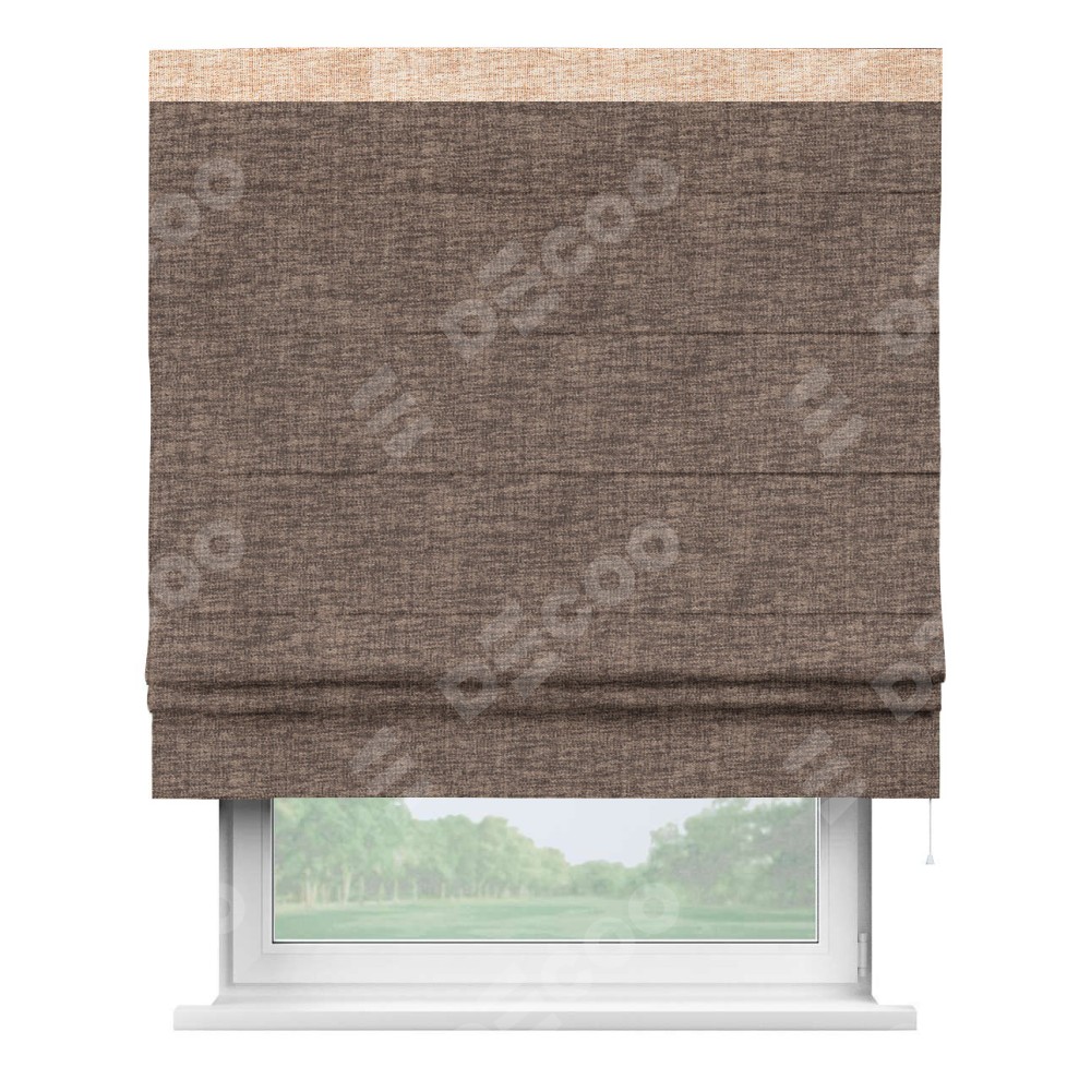 Римская штора пошита из ткани рогожка димаут коричневый, артикул: 91018, с отделкой кантом «Кинг» отличается своей необычной особенностью: кант располагается исключительно сверху шторы. Такой дизайн делает акцент на верхней части окна, визуально поднимая потолок и придавая интерьеру более возвышенный и изысканный вид. Отделка кантом на верхней кромке не только украшает штору, но и может служить дополнительной защитой от износа в месте наибольшего контакта с механизмом управления шторой.