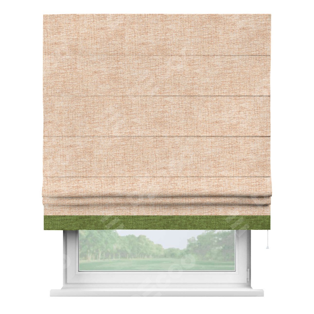 Римская штора пошита из ткани рогожка димаут персиковый, артикул: 91016, с отделкой кантом «Джестер» выделяется своей уникальной особенностью — кантом, расположенным только снизу шторы. Этот дизайн добавляет оригинальности и игривости оконному оформлению, делая акцент на нижней части шторы и создавая интересный визуальный эффект. Отделка кантом на нижнем крае не только служит эстетической функции, но и способствует увеличению прочности и износостойкости ткани в этом месте.
