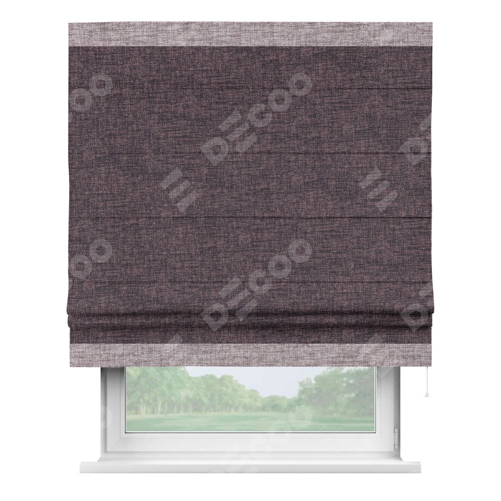 Римская штора пошита из ткани рогожка димаут розово-коричневый, артикул: 91020, с отделкой кантом «Горизонт» предлагает уникальное дизайнерское решение, при котором кант располагается только вверху и снизу шторы. Такое решение делает акцент на горизонтальных линиях, визуально расширяя пространство и придавая окну более строгий и организованный вид. Отделка кантом в этих ключевых местах не только украшает штору, но и способствует её долговечности, защищая наиболее уязвимые к износу края.