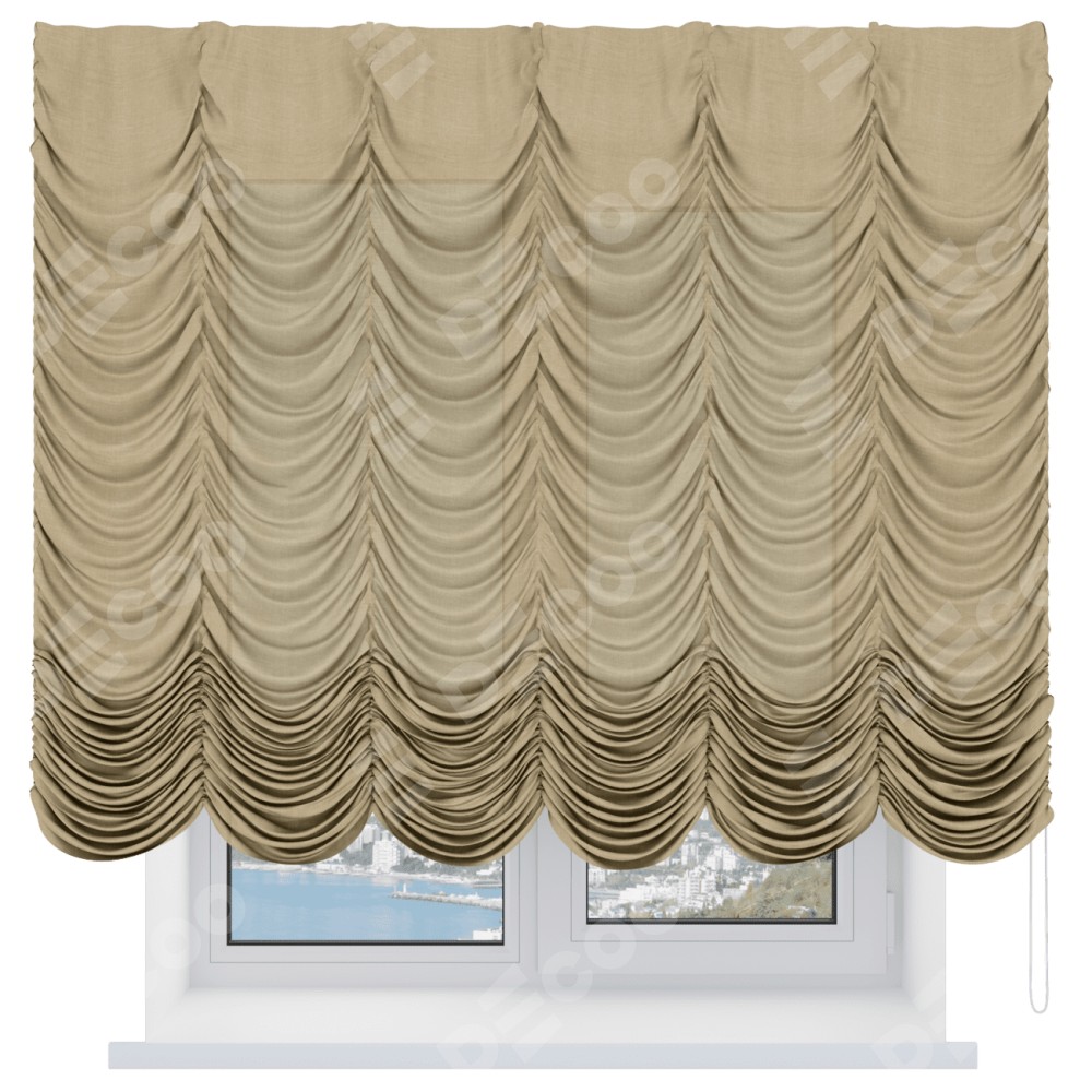 Французская штора производителя «Cortin», используется для проёма, пошита из ткани лён бежевый, артикул ткани 7442. Имеет универсальный механизм и подходит для монтажа: на потолок и на стену.