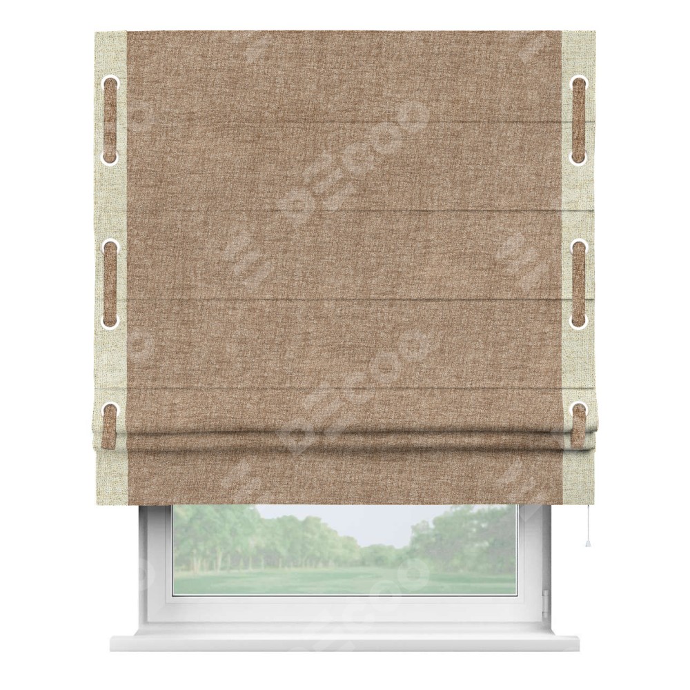 Римская штора «Кортин» для проёма, рогожка димаут светло-коричневый, с кантом Стрим Дуо (люверсы с пояском)